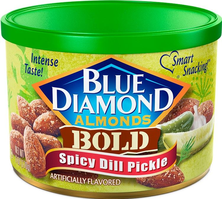 A bold new flavor of salty dill; Citrus vinegar and a spicy kick all wrapped around a satisfying crunchy almond; Contains 1 6-ounce can of spicy dill almonds; Ideal for a snack on the go