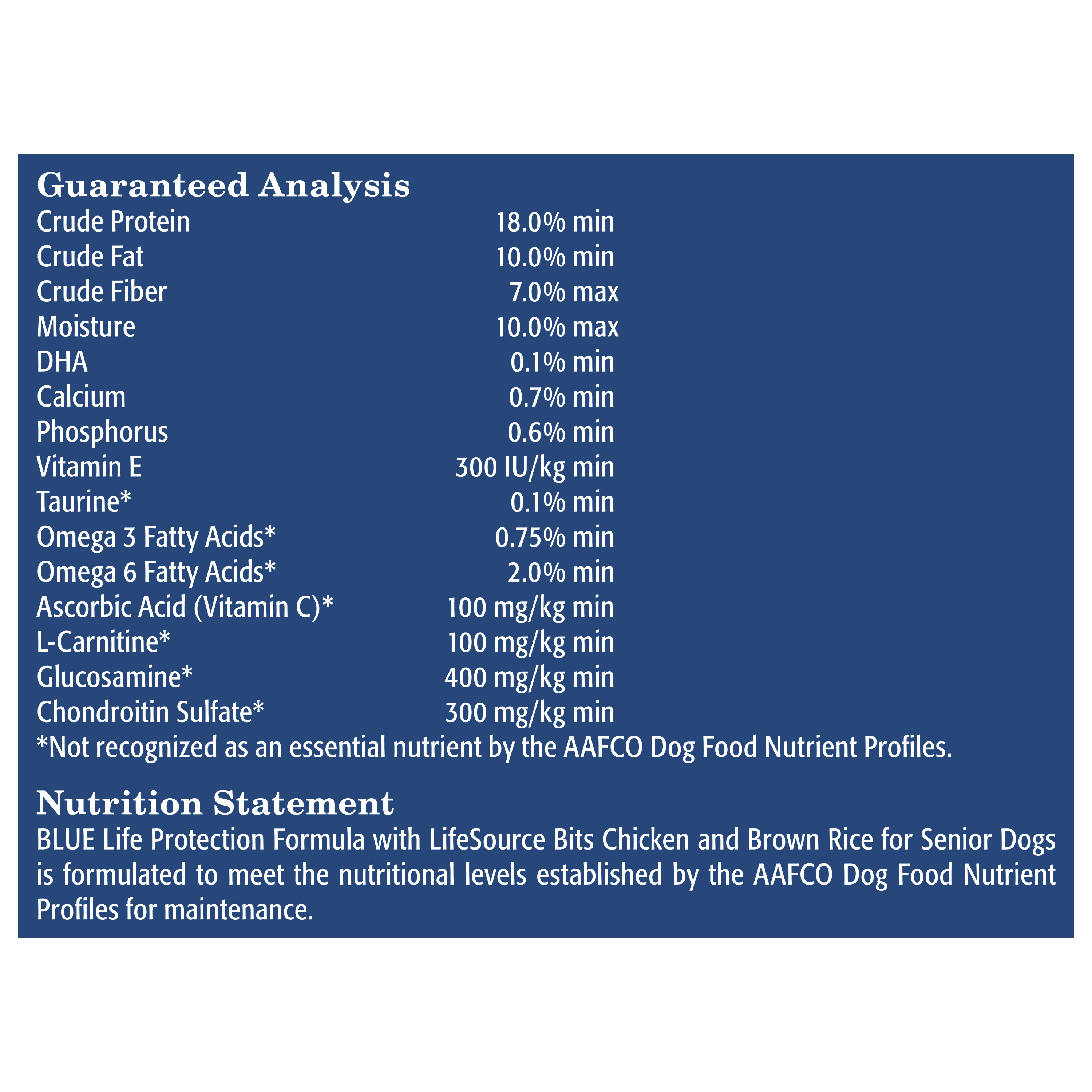 REAL MEAT FIRST: Blue Buffalo foods always feature real meat as the first ingredient; High-quality protein from real chicken helps your dog build and maintain healthy muscles; Plus they contain wholesome whole grains, garden veggies and fruit. FOR SENIOR DOGS: BLUE Life Protection Formula senior dog food contains glucosamine and chondroitin to help support joint health and overall mobility with essential proteins and carbohydrates to help maintain energy requirements for a healthy lifestyle. ANTIOXIDANT-RICH LIFESOURCE BITS: A precise blend of antioxidants, vitamins and minerals carefully selected by holistic veterinarians and animal nutritionists to support immune system health, life stage needs and a healthy oxidative balance. A NATURAL DOG FOOD: BLUE dry dog food is made with the finest natural ingredients enhanced with vitamins and minerals; BLUE contains NO chicken (or poultry) by-product meals, corn, wheat, soy, artificial flavors or preservatives.Specifications