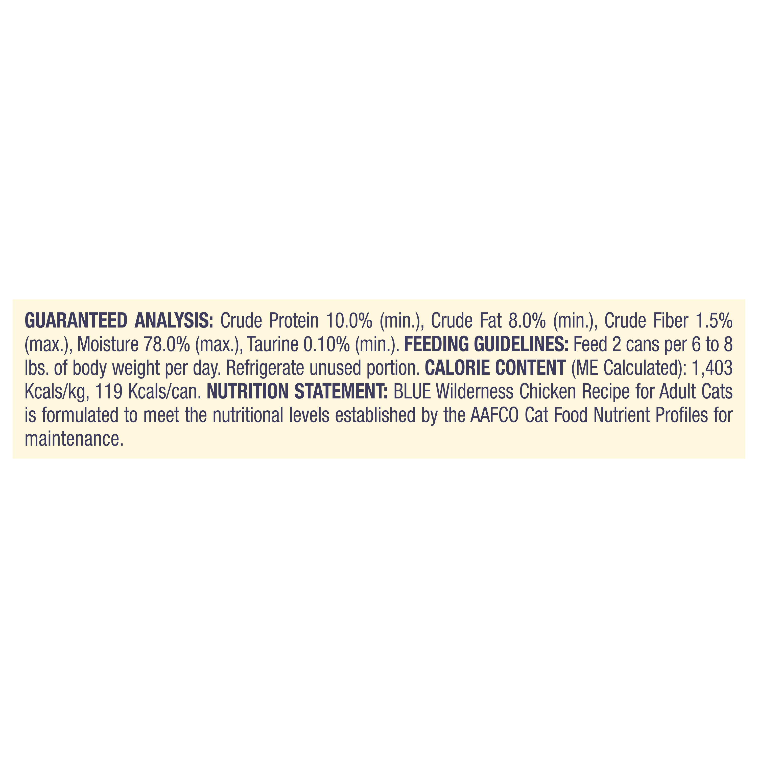 PACKED WITH REAL CHICKEN: This grain free cat food contains more of the chicken cats love to provide the energy your adult cat needs to stay active. PATE STYLE CANNED CAT FOOD: This high protein cat food features a smooth texture your feline friend can’t resist. NATURAL CAT FOOD: All BLUE canned cat foods are made with the finest natural ingredients enhanced with vitamins and minerals. MADE WITHOUT WHEAT: BLUE wet cat food contains NO chicken (or poultry) by-product meals, NO corn, wheat (a common thickening agent used by many other brands) or soy, and NO artificial flavors or preservatives.Specifications