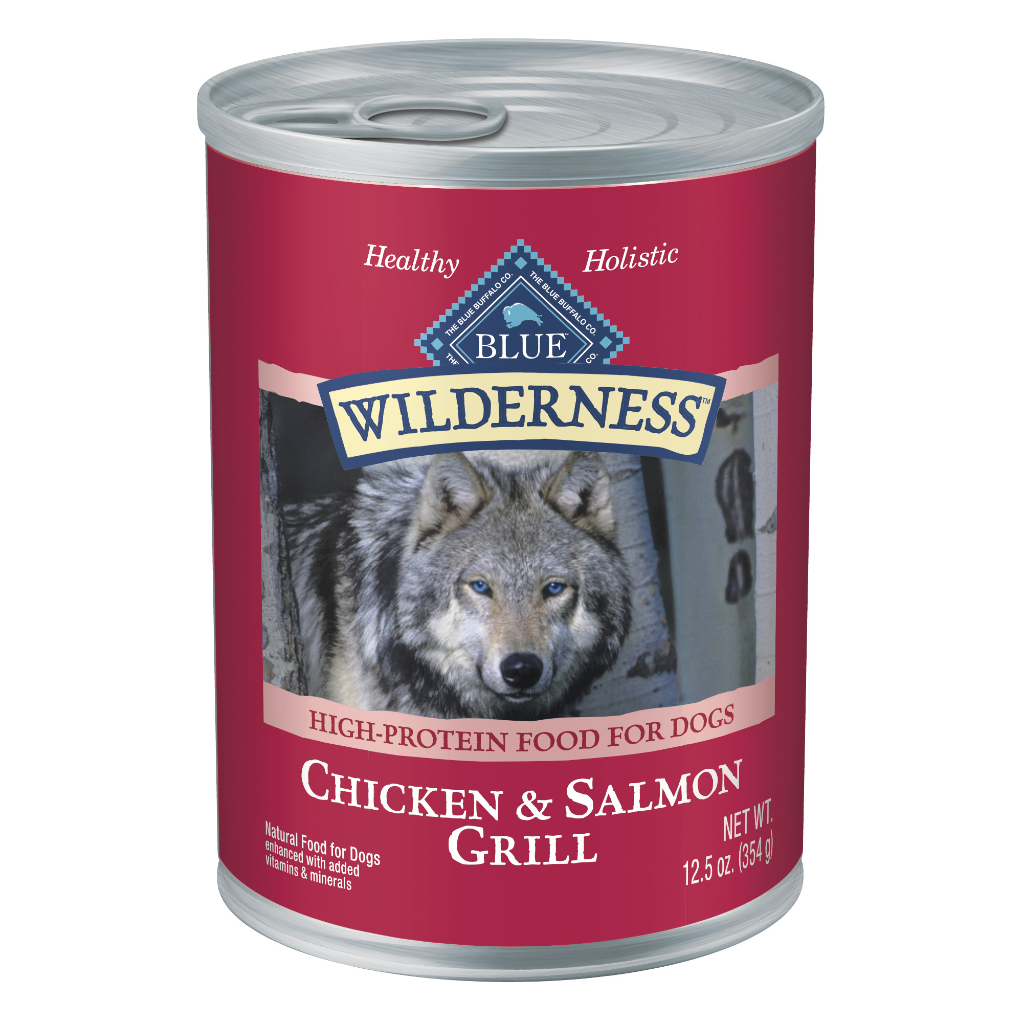 Packed with more of the meat dogs love and free of the grains that contain gluten, BLUE Wilderness wet dog food is made to feed your dogs wild side; With real salmon and chicken, plus fruits and vegetables, this grain free recipe features the finest natural ingredients enhanced with vitamins and minerals