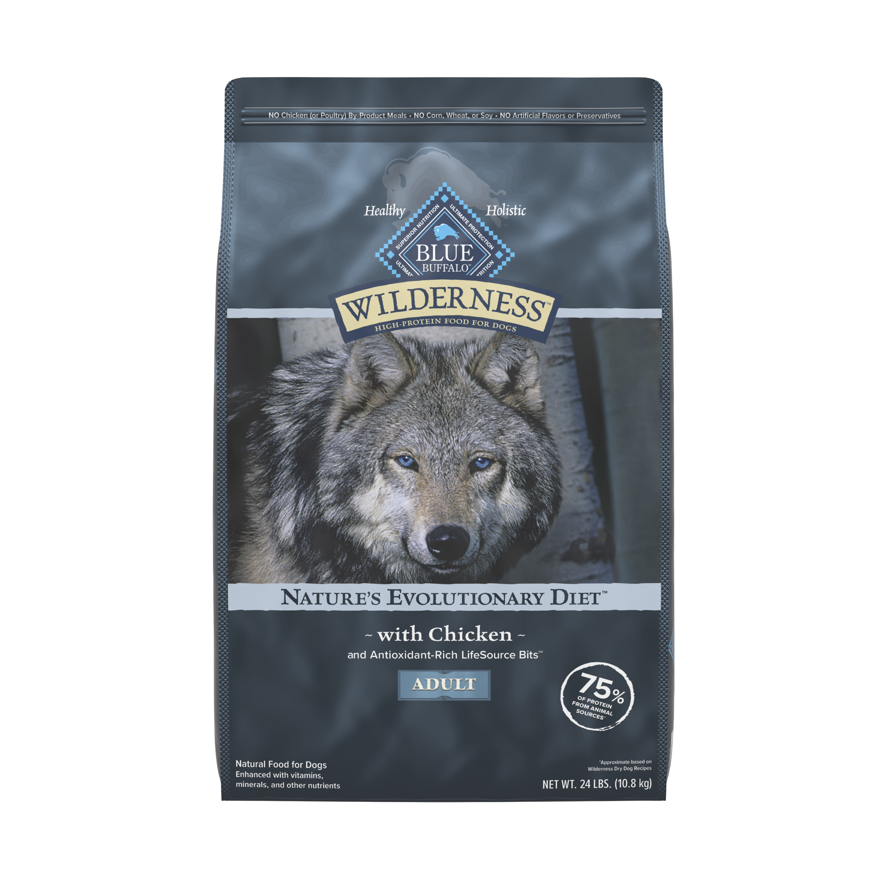 BLUE Wilderness natural dry dog food satisfies the spirit of the wolf in your canine with more of the meat dogs love; This high protein, grain free formula starts with delicious, protein-rich chicken, features antioxidant-rich LifeSource Bits and is enhanced with vitamins, minerals and other nutrients
