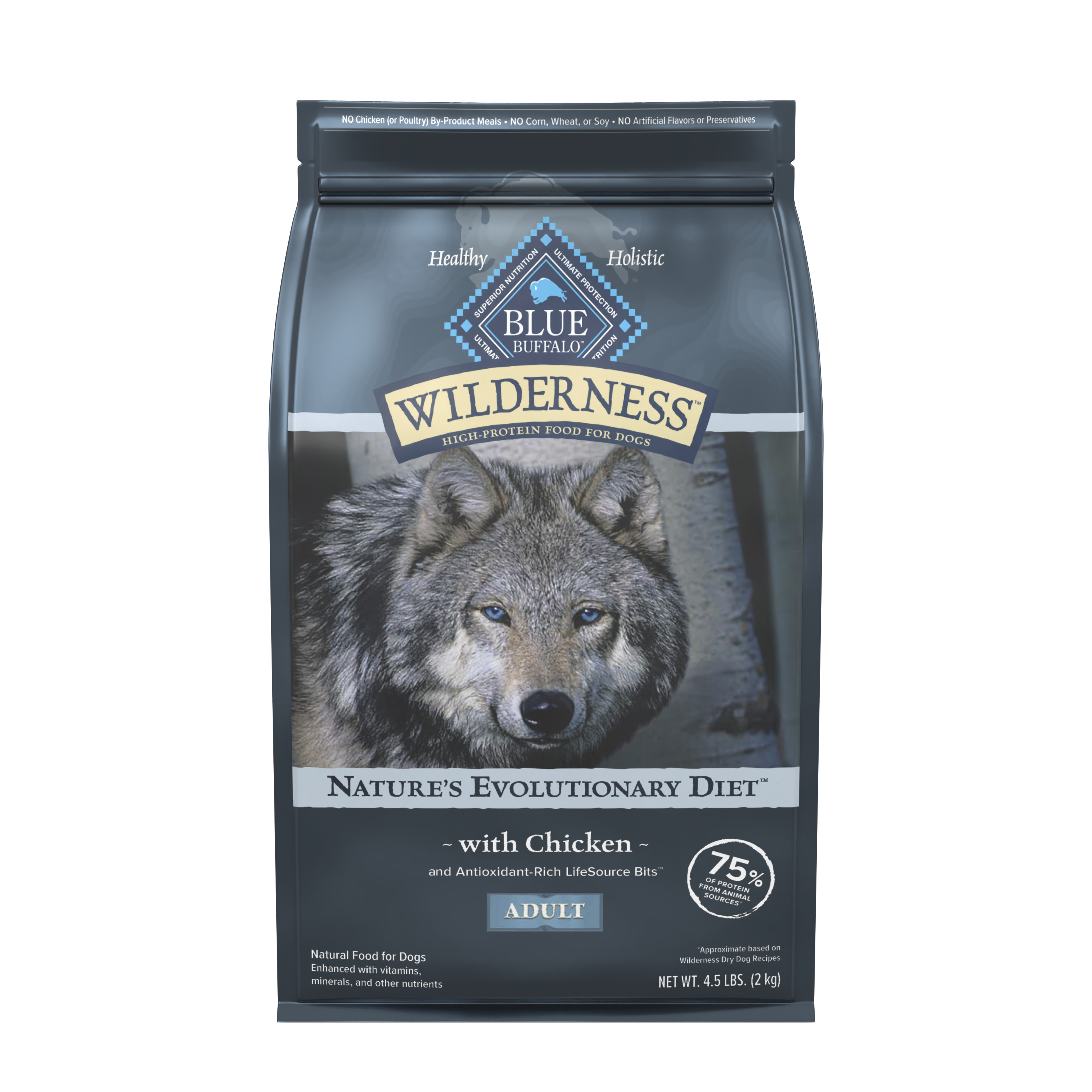 BLUE Wilderness natural dry dog food satisfies the spirit of the wolf in your canine with more of the meat dogs love; This high protein, grain free formula starts with delicious, protein-rich chicken, features antioxidant-rich LifeSource Bits and is enhanced with vitamins, minerals and other nutrients