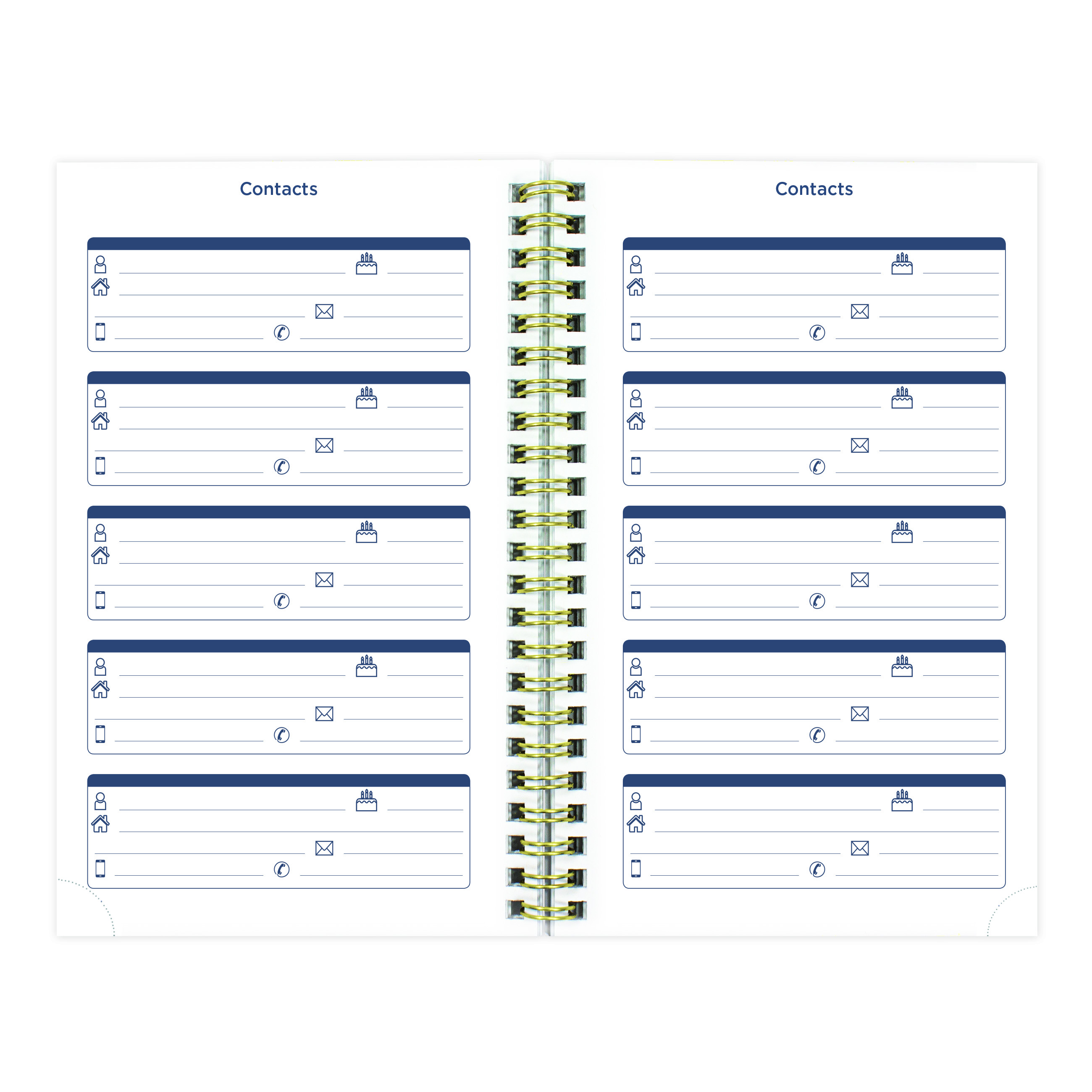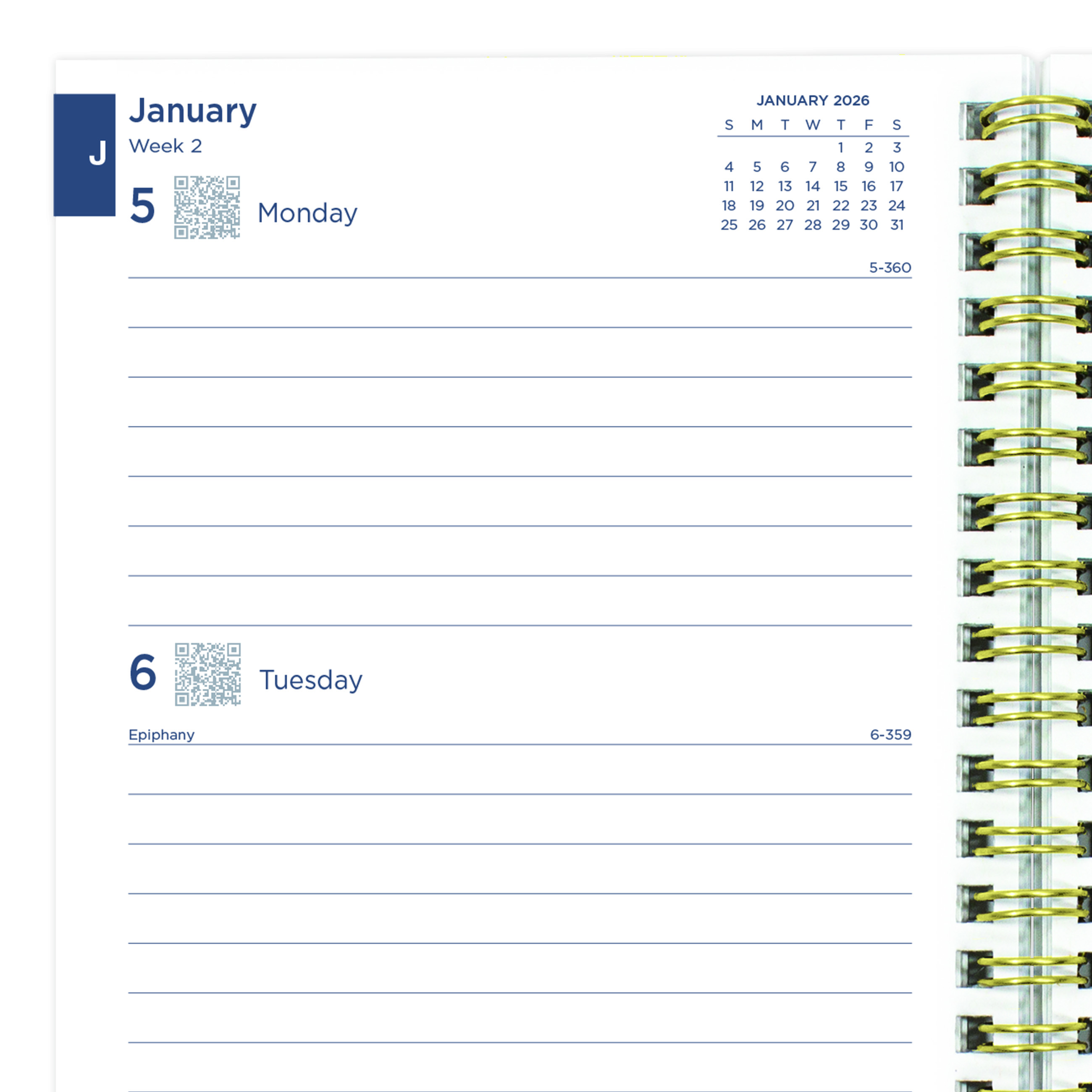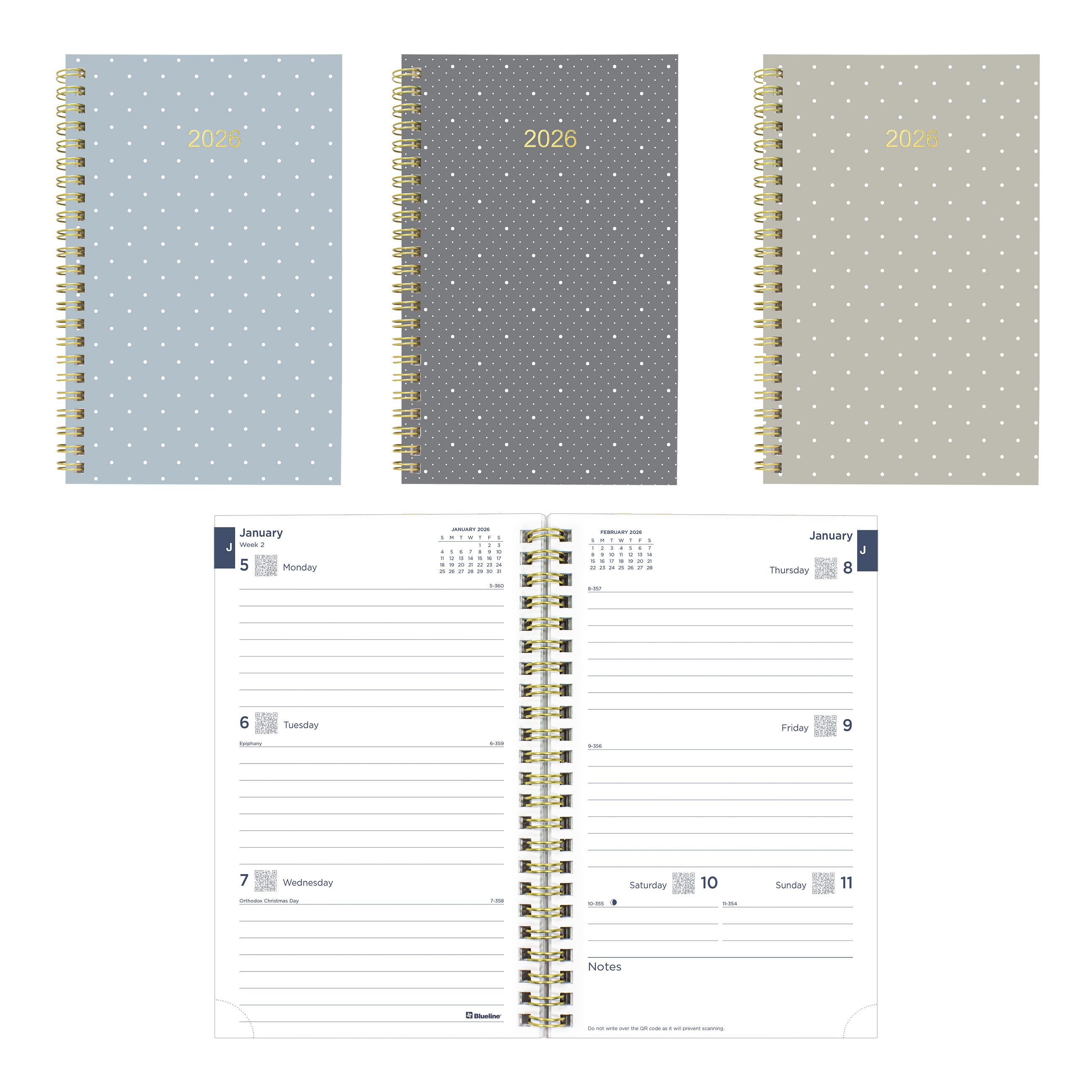 (WE CANNOT GUARANTEE A SPECIFIC COLOR) If you'd like us to choose for you, we are more than happy to do so. If not,please visit us in store to pick your favorite color. The Blueline Essential Weekly/Monthly Planner, in pleasing Minimalist design, features 12 months from January to December 2026, with week on two-pages spread and monthly planner before each month. Ruled space for each day. Flexible gold twin-wire binding with durable, poly cover allows planner to fold back for a flat and sturdy writing surface. Includes: reference calendars of current and future months, numbered weeks, countdown of days passed and days to come (Julian dates), holidays, moon phases, and tear-off corners help keep place. Extra bonus pages include: quarterly planners, dedicated contacts (telephone/address/email) and notes sections. English, size: 8" x 5". Eco-conscious planner crafted from 100% post-consumer recycled paper. Certified under FSC license code: FSC C102682. The Forest Stewardship Council enables businesses and consumers to choose products made with materials sourced from responsible forestry, promoting environmentally appropriate, socially beneficial, and economically viable management of the world's forests. Made in Canada.The future of planning is here with Blueline Plan & Link. Just plan, scan, click, and go for synchronicity in planning. Link your compatible Blueline planner featuring Plan & Link to your phone using the QR codes printed in the planner for seamless pen to technology synchronization. Write in your planner, scan the QR code printed on the date, take a picture, and set the date and reminder using the free Blueline Reminder app. Download the free Blueline Reminder app, powered by InkLink technology, from the App Store and Google Play. Blueline is the brand of choice when it comes to selection and affordability. Used in the office, home or classroom, the extensive line of Blueline dated products offers the widest variety of formats and constructions to meet every possible need. Blueline Dated Products are produced using acid-free paper to prevent color-change over time and vegetable oil-based inks to help protect the environment. Blueline since 1917. (C101PT.ASX)Specifications