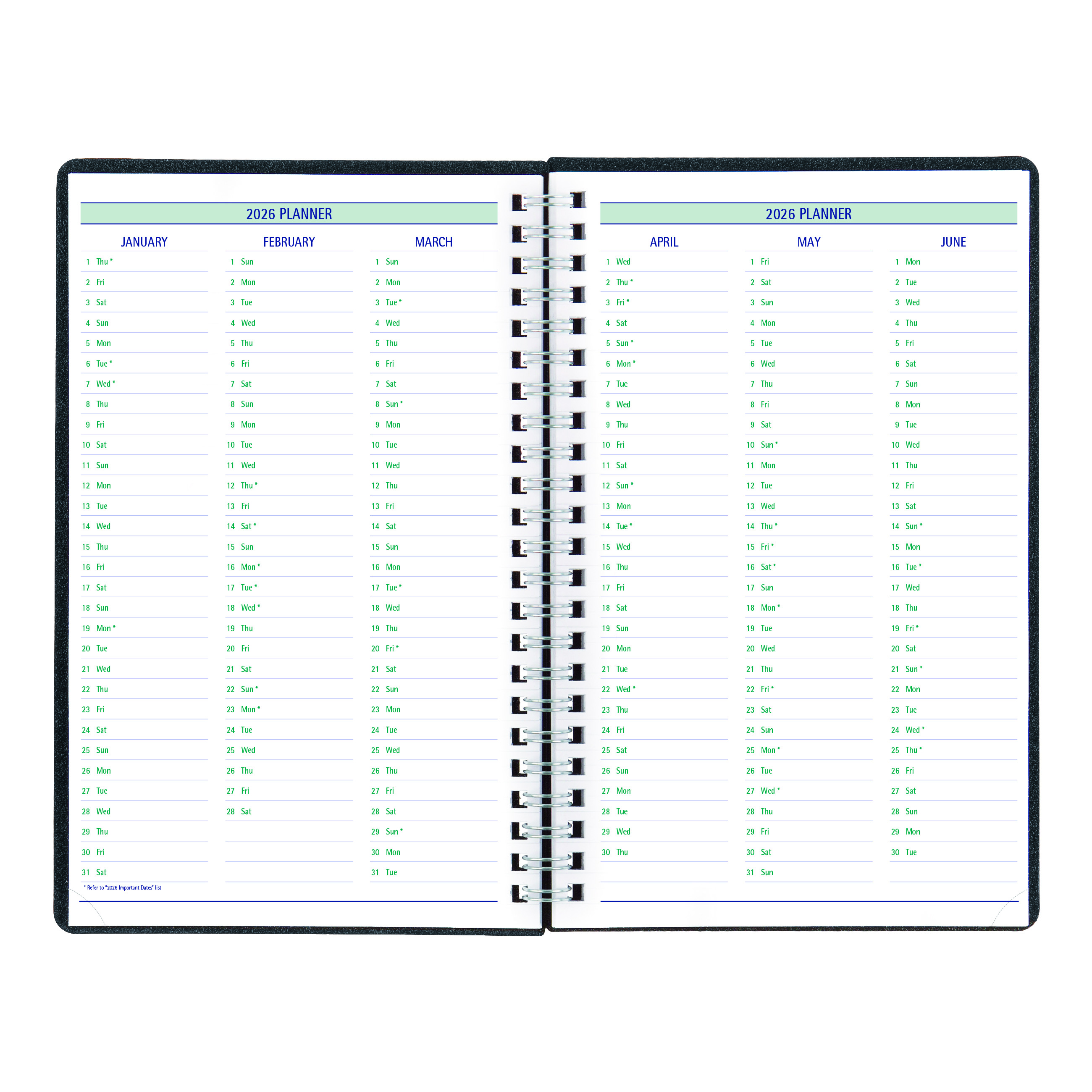 100% post-consumer recycled paper. Certified under FSC license code: FSC C102682.; 30-minute appointment schedule 7:00 a.m. to 8:30 p.m., ruled spaces for Saturday/Sunday.; Priorities, note boxes.; Timanager DuraFlex Weekly/Monthly 5-Day Planner/Appointment Book, spans 13 months, December 2025 to December 2026.; Two-piece, heavy-duty poly cover, twin-wire binding, weekly and monthly spreads.