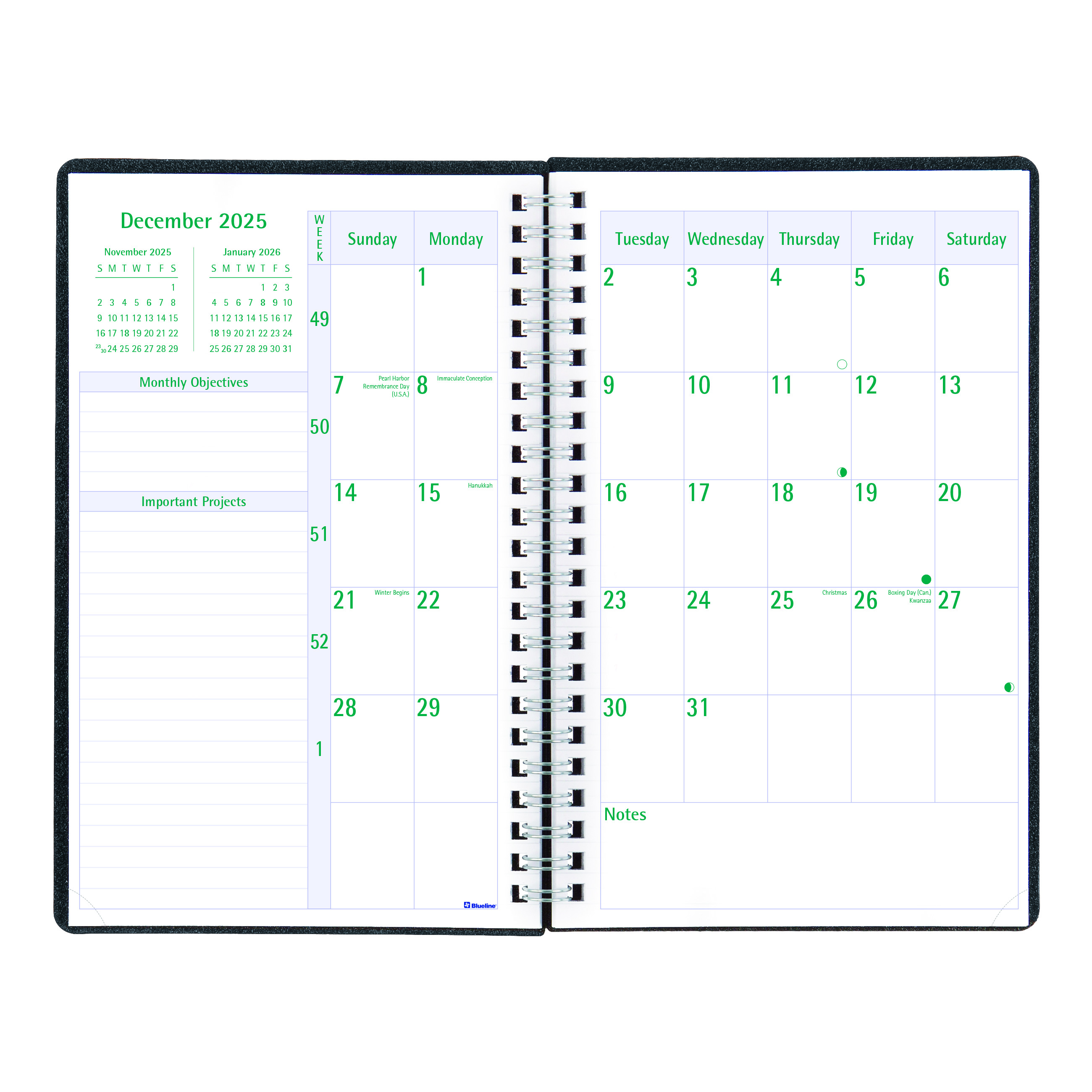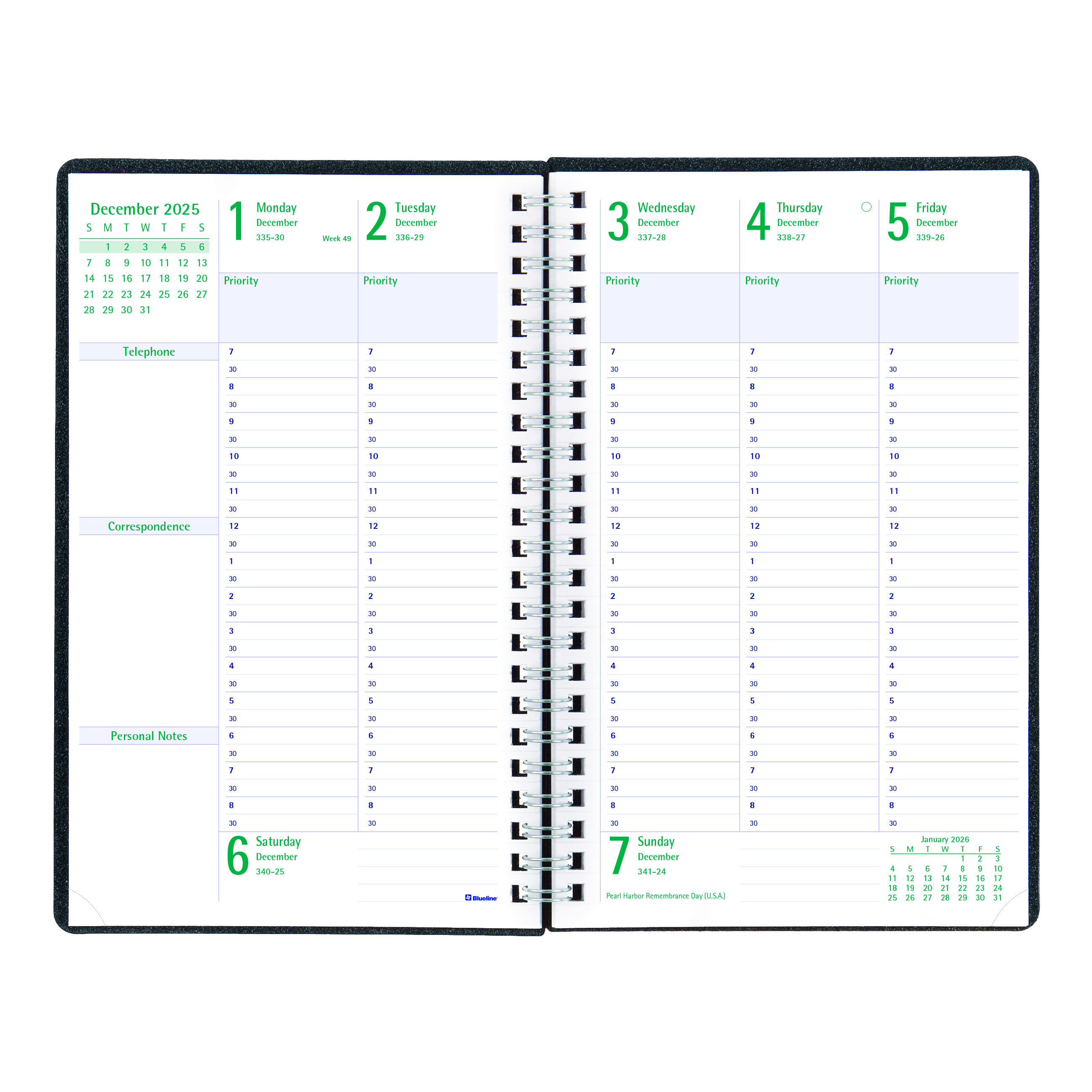 Manage scheduling with flexibility and ease. The Blueline Timanager DuraFlex Weekly/Monthly 5-Day Planner and Appointment Book features 13 months of planning, spanning December 2025 to December 2026, with one week per two-page spread in an appointment schedule format. The two-piece, heavy-duty poly cover is durably constructed with flexible twin-wire binding for a flat and sturdy writing surface. Appointment schedule from 7:00 a.m. to 8:30 p.m. in half-hour intervals. Ruled spaces for Saturdays and Sundays. Monthly planner before each month with objectives and important projects. Contains reference calendars of past, current and future months on each monthly spread, countdown of days passed and days to come (Julian dates), highlights holidays and phases of the moon. Weekly spreads include daily, weekly priorities, boxes for notes, correspondence and phone calls. Tear-off corners to help keep place. Extra bonus pages include: dedicated notes and contacts (telephone/address/email) sections. Black cover. English, size: 9-3/8" x 6". Eco-conscious planner crafted from 100% post-consumer recycled fiber paper materials. Certified under FSC license code: FSC C102682. The Forest Stewardship Council enables businesses and consumers to choose products made with materials sourced from responsible forestry, promoting environmentally appropriate, socially beneficial, and economically viable management of the world's forests. Made in Canada.Professional Time Management - Today's active managers have hectic schedules that often require a multitude of appointments and projects each day. The Blueline Timanager Series was especially designed as a survival tool for time management. Blueline is the brand of choice when it comes to selection and affordability. Used in the office, home or classroom, the extensive line of Blueline dated products offers the widest variety of formats and constructions to meet every possible need. Blueline Dated Products are produced using acid-free paper to prevent color-change over time and vegetable oil-based inks to help protect the environment. Blueline since 1917. (C5910V.81)Specifications