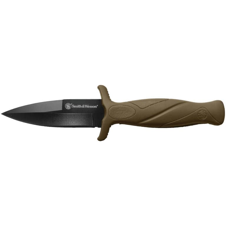 The Smith & Wesson FDE Boot Knife is made with a black oxide coated high carbon stainless steel blade and features a rubberized handle.Specifications