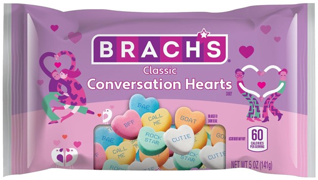 Snack, bake, and craft your heart out with Brach’s iconic Conversation Hearts. Phrases like "Love You" and "XOXO" are printed on each piece, so you can share something sweet with your favorite people. With the popular flavors of lemon-lime, banana, cherry, grape, orange, and wintergreen, there's sure to be a flavor you'll love.Specifications