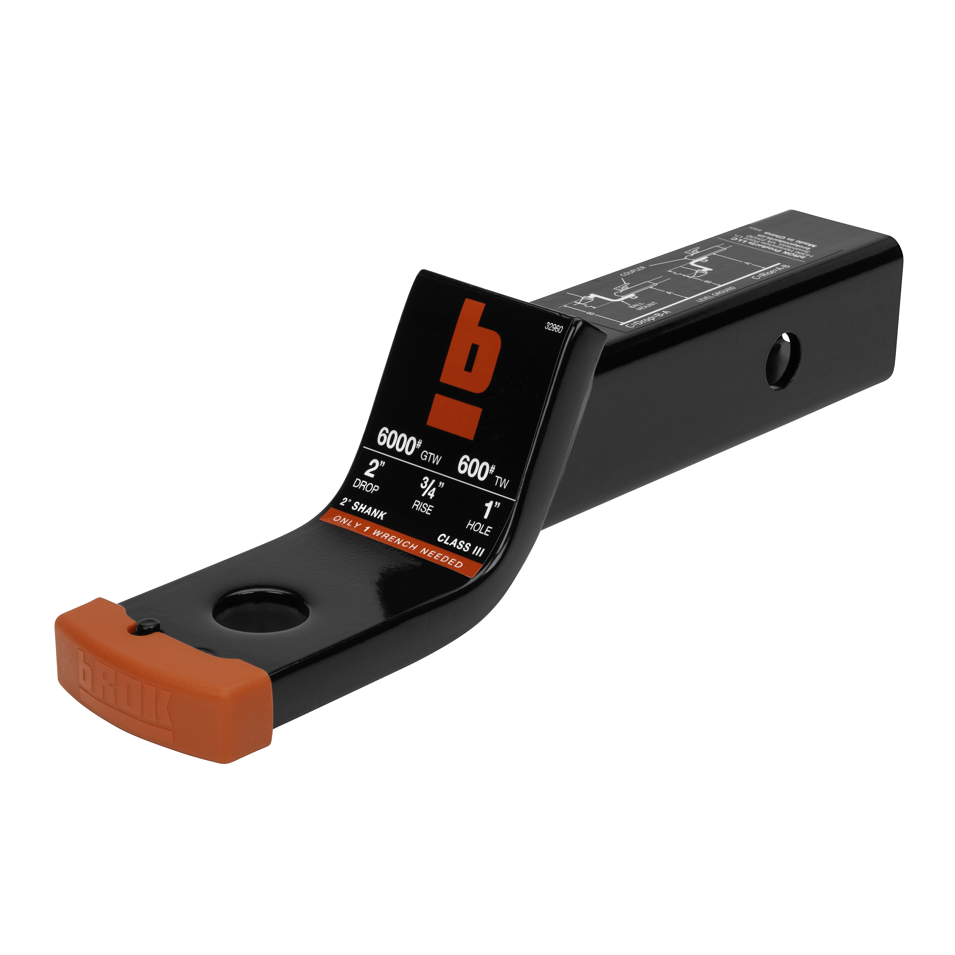 2 inch drop; 2inch shank; Rated 6000 lbs; This bROK ball mount provides optimal trailer towing with a 2-in drop from the top of your receiver to aid in leveling your trailer while towing. The bROK ball mount is made of welded steel with black