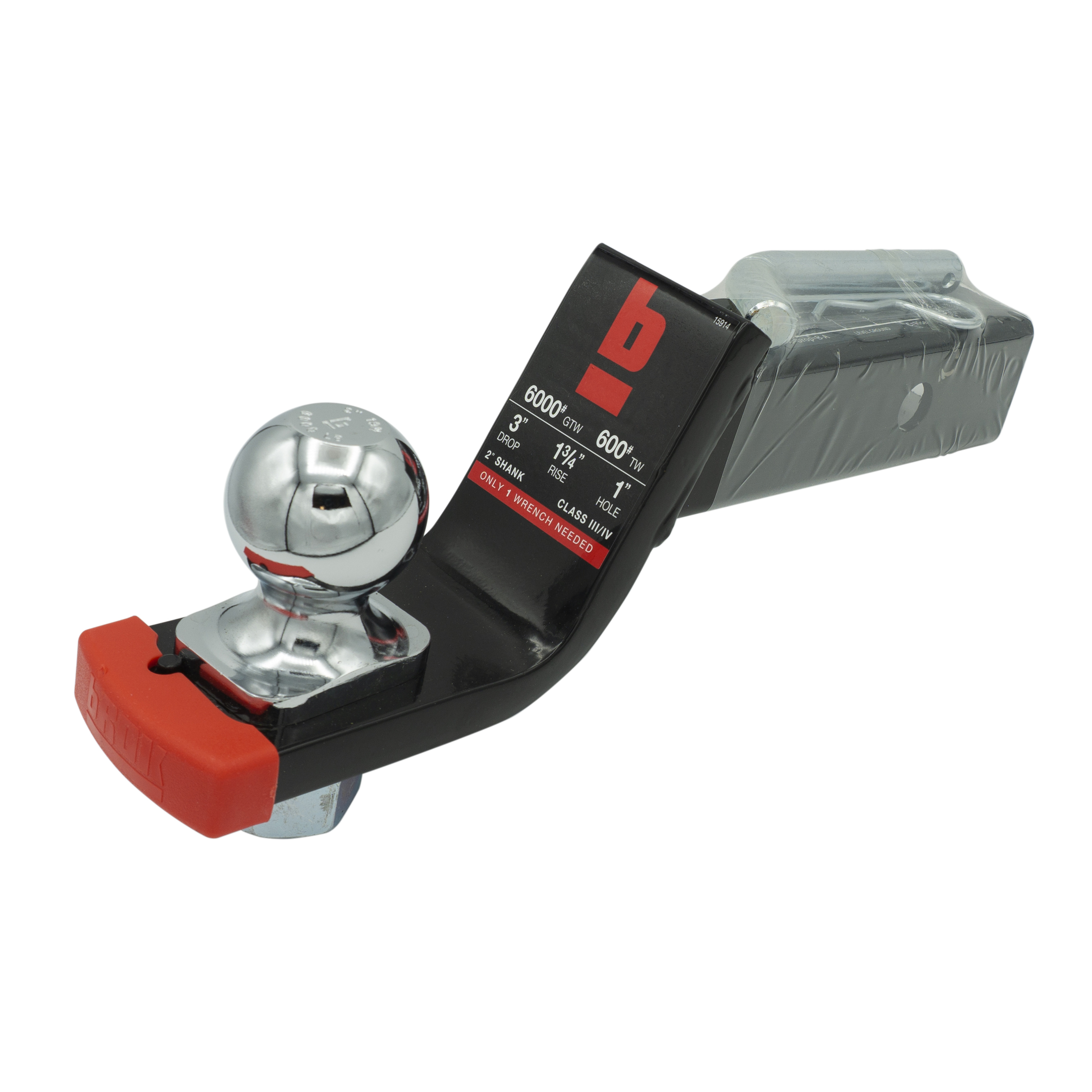 2 inch ball; 2 inch shank; 3 inch drop; 6000lb capacity; includes Pin and clip; The bROK towing starter kit conveniently includes all you need to safely connect your trailer to your vehicle. The bROK starter kit includes an assembled hitch ball that is accurately torqued onto the