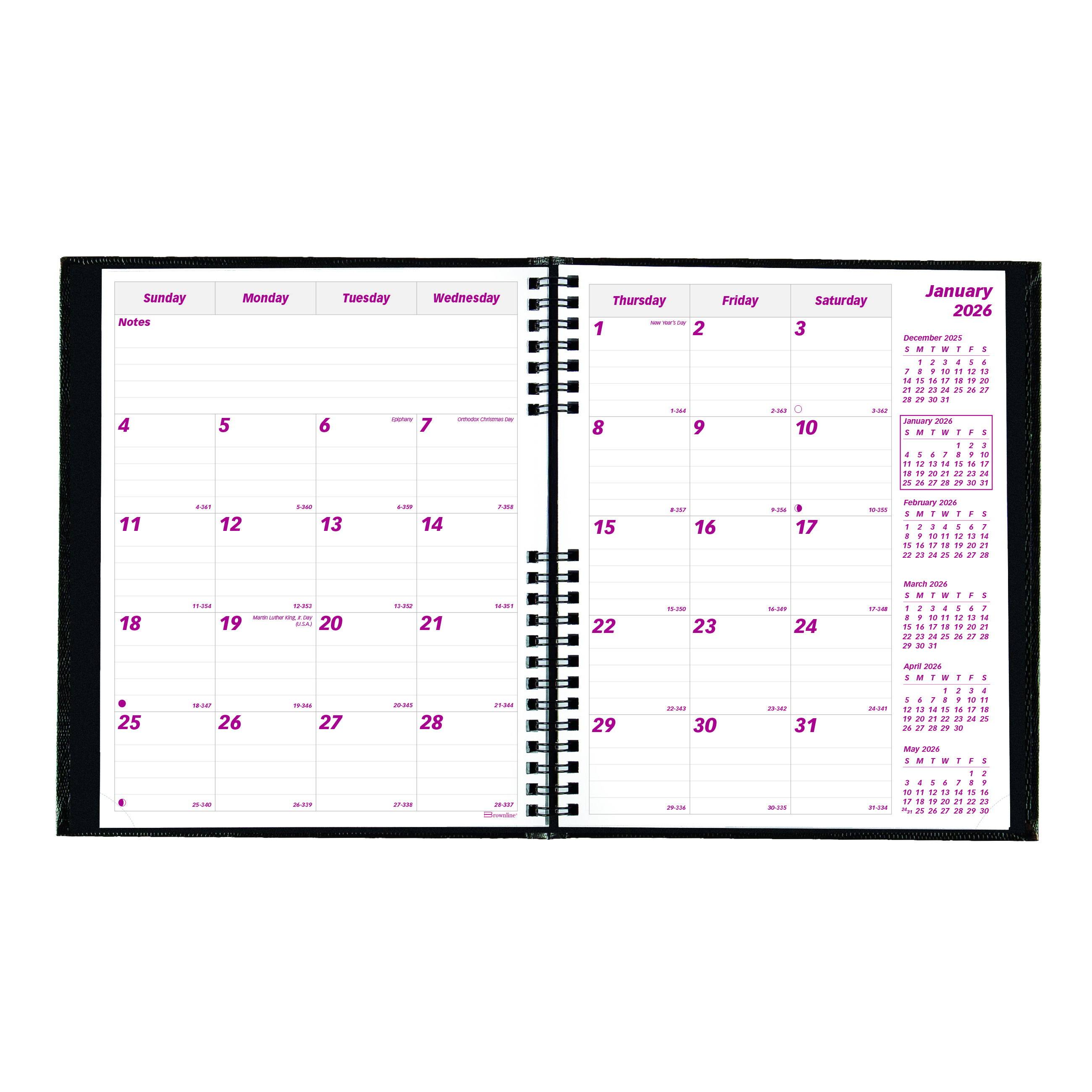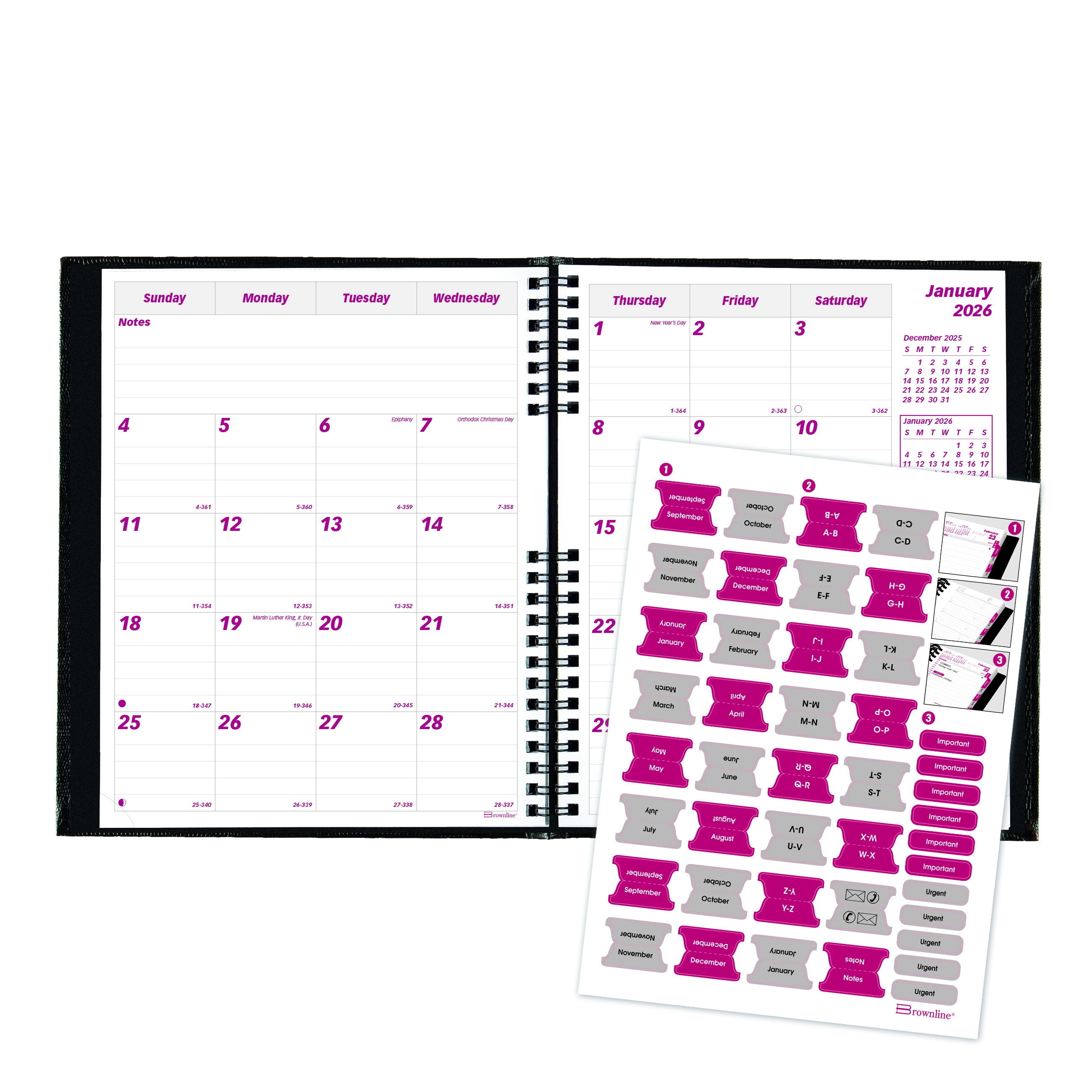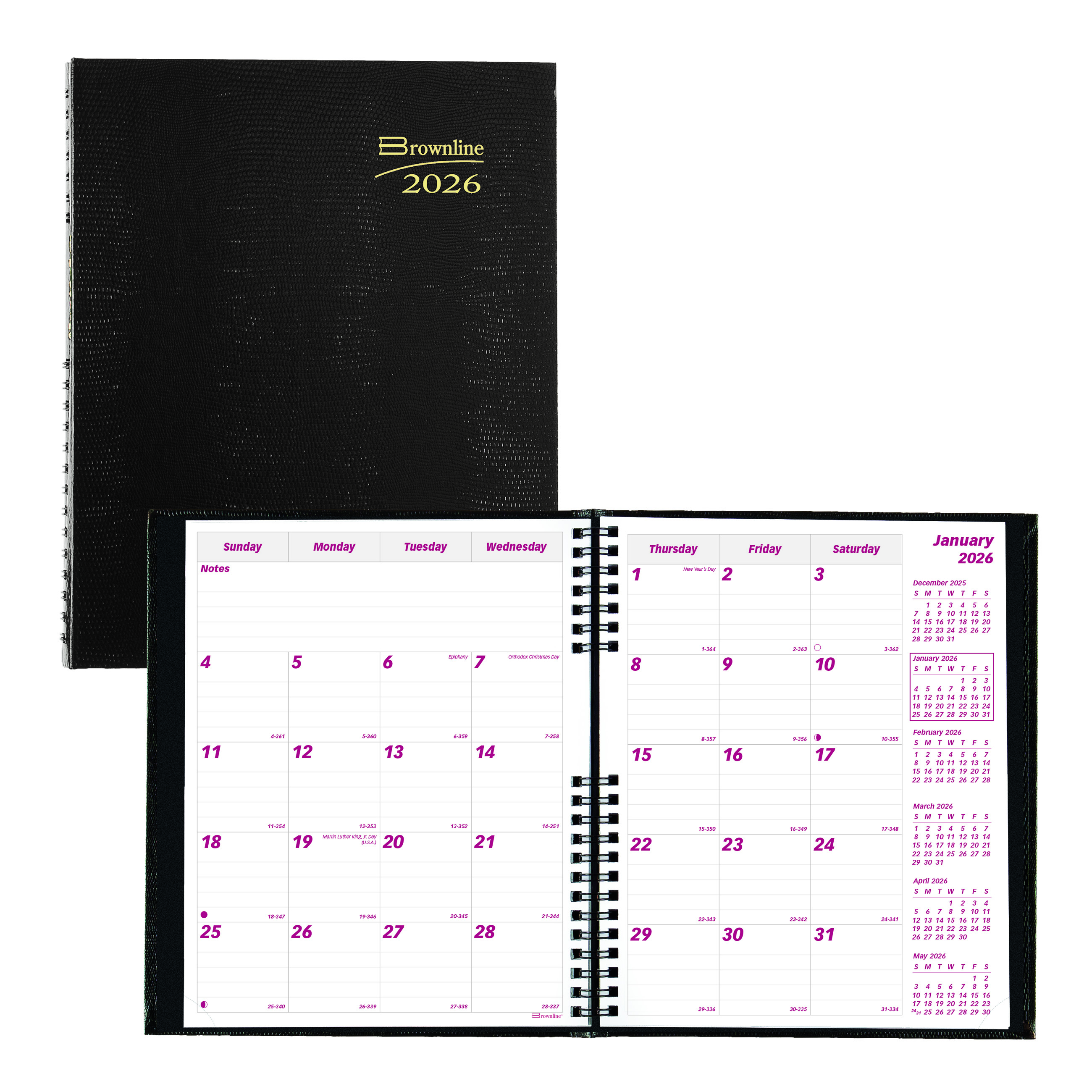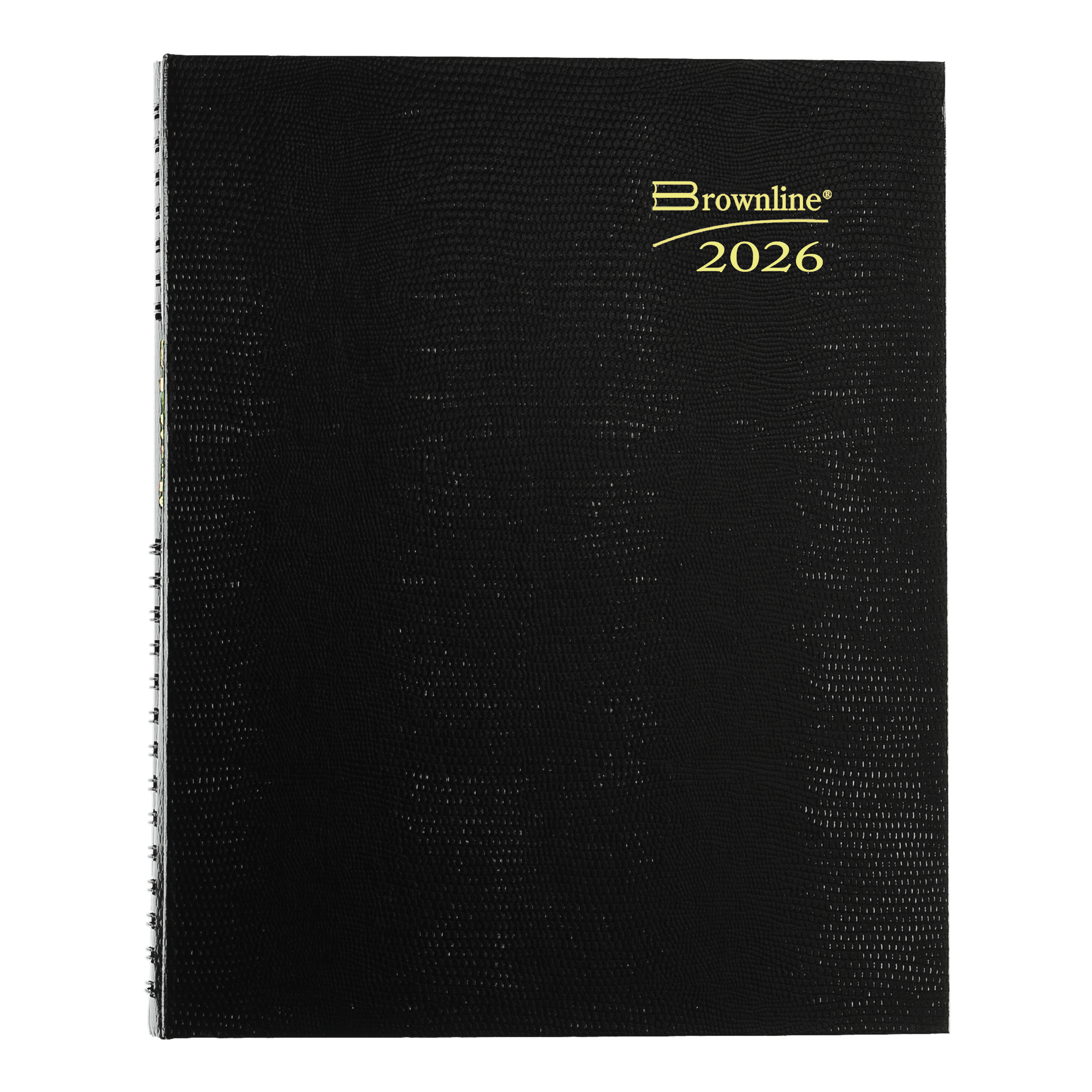 The Brownline CoilPro Monthly Planner features 14 months of planning, spanning December 2025 to January 2027, with one month per two-page spread, one ruled block per day. Contains reference calendars of past, current and future months and space for notes. Daily countdown of days passed and days to come, highlights holidays and phases of the moon. Tear-off corners to help keep place. Contacts (telephone/address/email) section. Includes self-adhesive tabs and storage pocket. The durable hard cover is constructed with flexible twin-wire binding for a flat and sturdy writing surface. English, size: 8.875" x 7.125". Eco-conscious planner crafted from 100% post-consumer recycled paper. Certified under FSC license code: FSC C102682. The Forest Stewardship Council enables businesses and consumers to choose products made with materials sourced from responsible forestry, promoting environmentally appropriate, socially beneficial, and economically viable management of the world's forests. Made in Canada.CoilPro patented planners combine the flexibility of a twin-wire book with the durability of a hard cover, available in a variety of sizes and formats. Brownline is the brand of choice when it comes to selection and affordability. Used in the office, home or classroom, the extensive line of Brownline dated products offers the widest variety of formats and constructions to meet every possible need. Brownline Dated Products are produced using acid-free paper to prevent color-change over time and vegetable oil-based inks to help protect the environment. Brownline since 1846. (CB1200C.BLK)Specifications