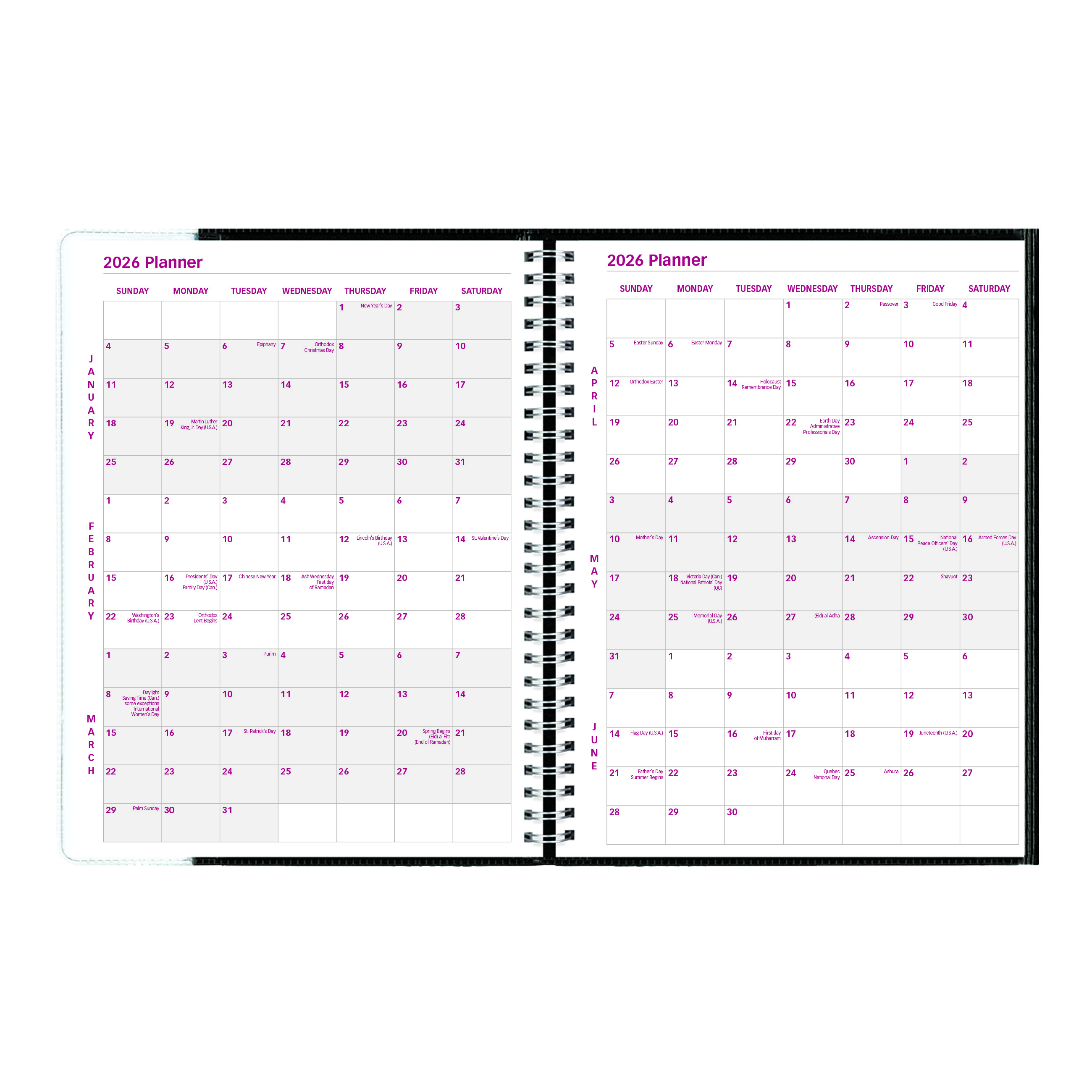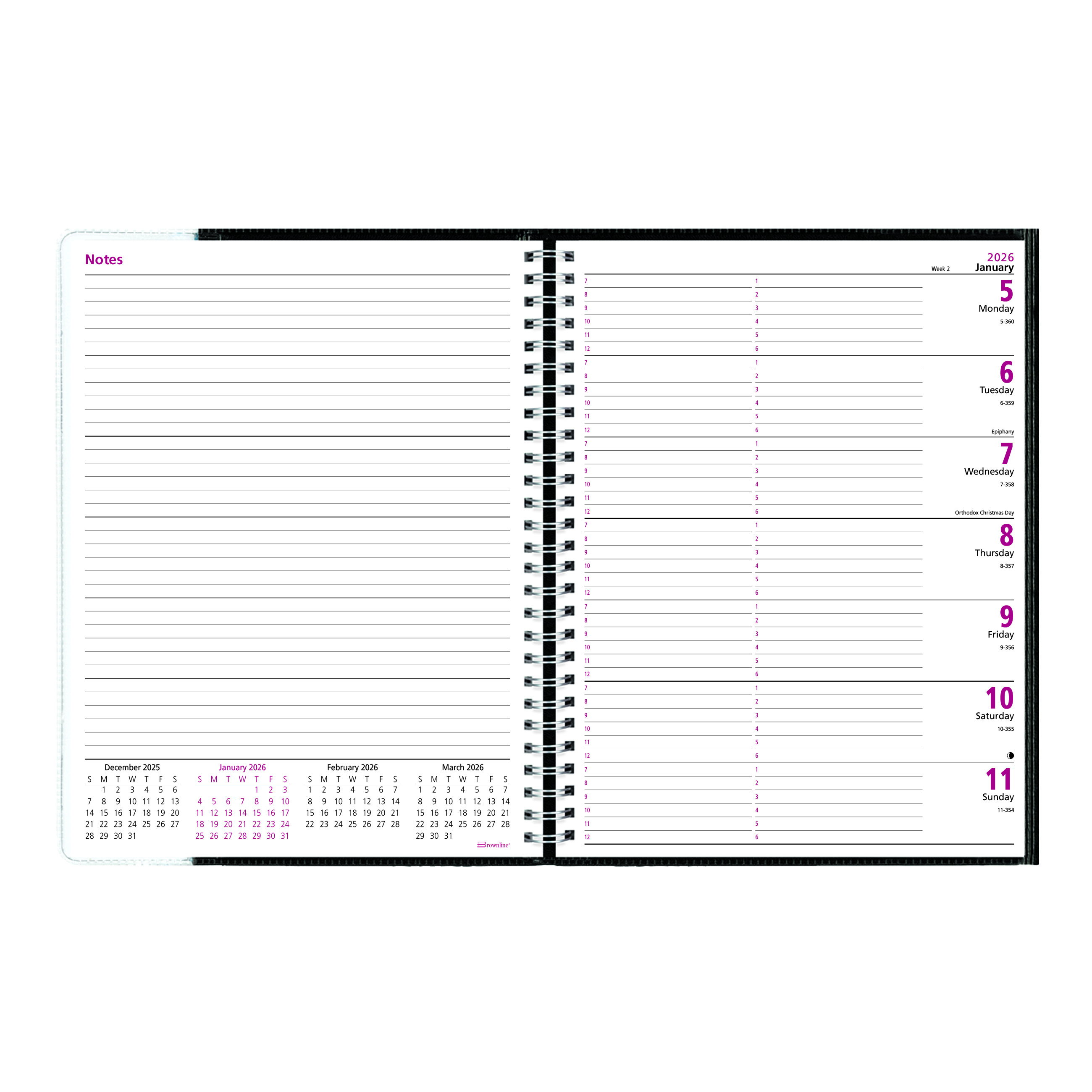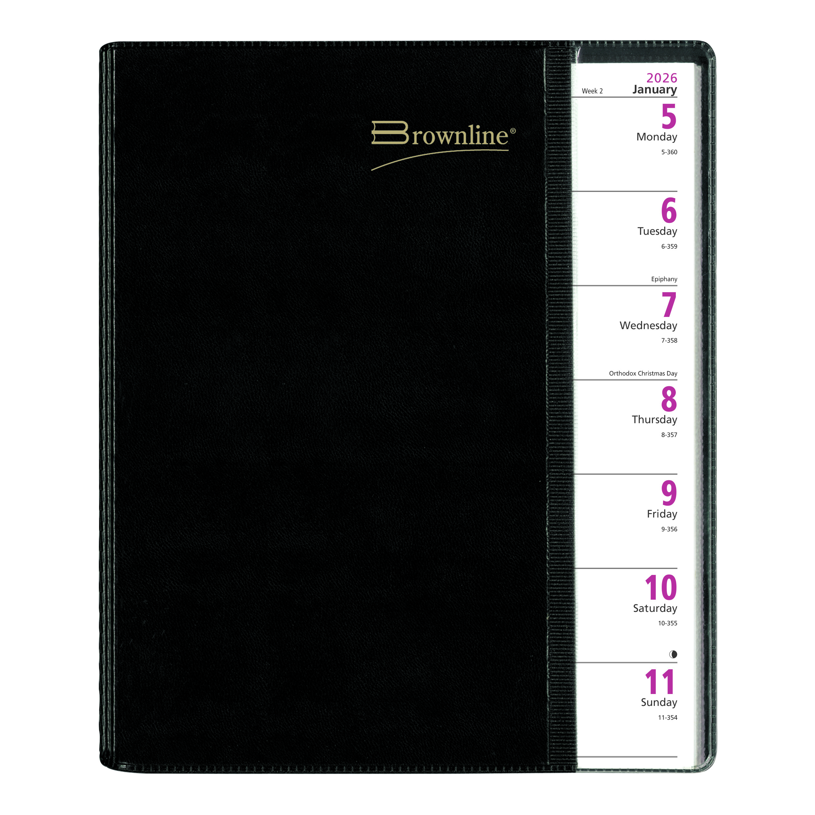 Always on the right page with Pre-Vu! The Brownline Pre-Vu Weekly Planner contains 12 months of planning, from January 2026 to December 2026, in a crafty, three-panel FLIP and FOLD cover with flexible, twin-wire binding. Pre-Vu incorporates an interior flap to pick up where you left off with ease: Flip the right-side page to show the current week. Fold the left notes page underneath. View the current week through the front-cover transparent window. Contains hourly appointment schedule from 7:00 a.m. to 6:00 p.m. for the full week with ruled notes area for each day. Practical attention to detail includes: quarterly planners for 2026 and 2027, reference calendars of past, current and future two (2) months on each spread, countdown of days passed, days to come (Julian dates), numbered weeks, and expense summary. Black cover. English, size: 11" x 8-1/2". Eco-conscious planner crafted from 100% post-consumer recycled fiber paper materials. Certified under FSC license code: FSC C102682. The Forest Stewardship Council enables businesses and consumers to choose products made with materials sourced from responsible forestry, promoting environmentally appropriate, socially beneficial, and economically viable management of the world's forests. Made in Canada.Innovation is once again at the crossroads with Pre-Vu, a weekly planner that gives you a new way of looking at the coming week. Brownline is the brand of choice when it comes to selection and affordability. Used in the office, home or classroom, the extensive line of Brownline dated products offers the widest variety of formats and constructions to meet every possible need. Brownline Dated Products are produced using acid-free paper to prevent color-change over time and vegetable oil-based inks to help protect the environment. Brownline since 1846. (CB925.BLK)Specifications