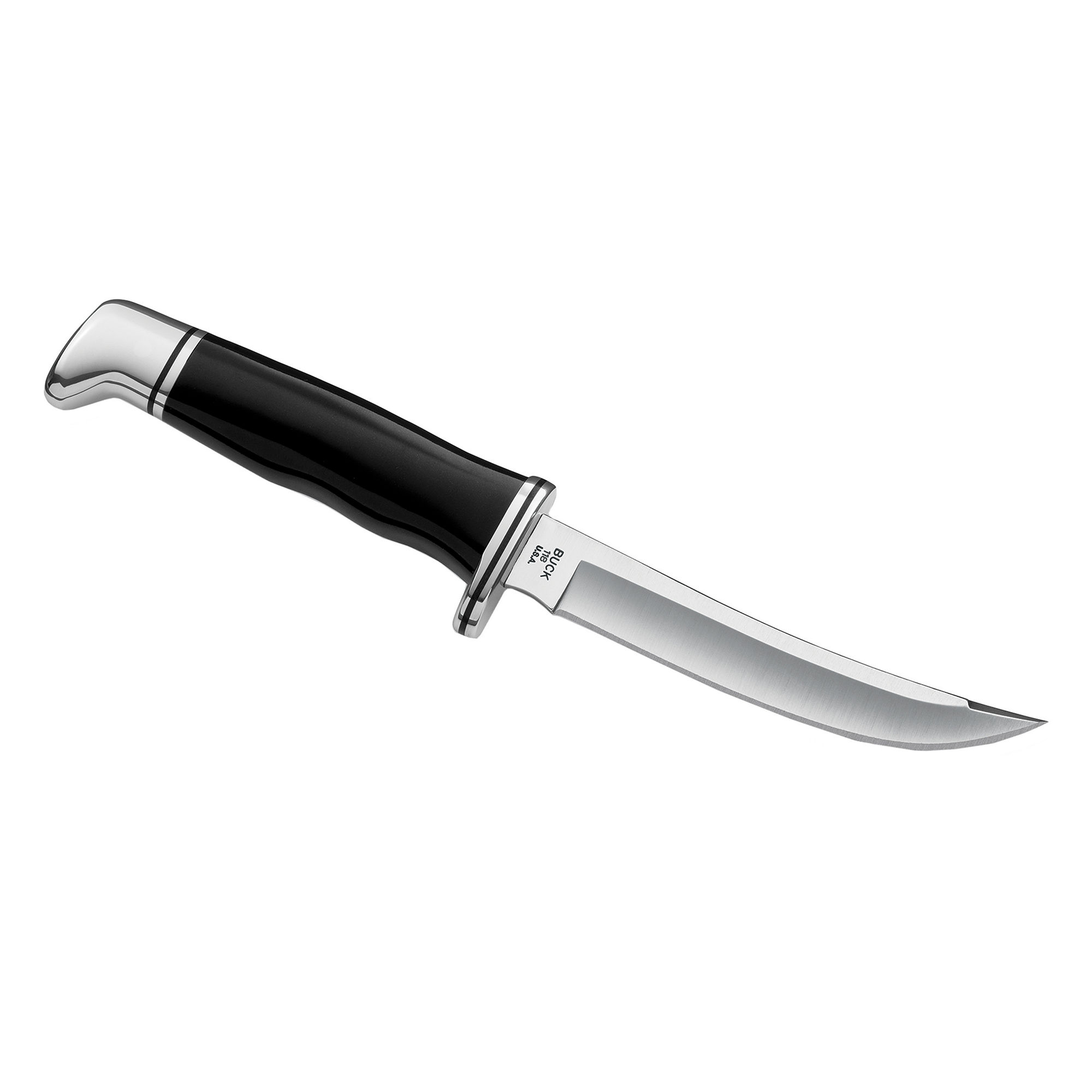 This classic large hunting knife has been a super seller going back some 47 years. Hoyt and Al Buck used to build them by hand in their two-man shop. Today, this larger hunting knife with a large clip blade for detail work, piercing and cutting in tight places for added control, is as popular as ever. Black leather sheath is included. Made in the USA. Forever Warranty.Specifications