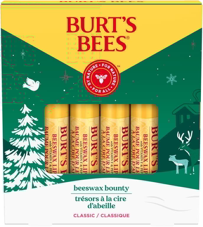 Give your loved ones a holiday gift from the heart that includes kissable, moisturized lips with a Burt’s Bees Lip Balm Beeswax Bounty Gift Set. Infused with beeswax to moisturize and soften lips, the nourishing oils in this lip moisturizer will make your loved ones feel confident giving you a kiss on the cheek with this classic gift. With a matte finish and moisturizing balm texture, these tint-free lip balm tubes glide on smoothly to nourish dry lips while keeping them revitalized and hydrated. Formulated without parabens, phthalates, petrolatum, and SLS, these lip balms are 100% natural to revitalize and beautify lips with clean ingredients. One lip balm set contains four lip balms. Your loved ones and guests can conveniently tuck a tube into their pockets or purse to keep natural, nurturing lip care handy always. Include Burt’s Bees Lip Balm Beeswax Bounty Gift Set in holiday gift baskets during Christmas, Hanukkah, or Kwanzaa alongside other classic Burt’s Bees products for a complete set of natural lip balm and skin care products that your loved ones will be joyous to receive. They even make great stocking stuffers or office holiday gifts for your coworkers. Use Burt’s Bees lip balm to make lips feel their best. Playing by nature’s rules since 1984, Burt’s Bees uses ingredients from nature to nourish and revitalize your skin and lips; they make products that have become a staple of your household.Specifications