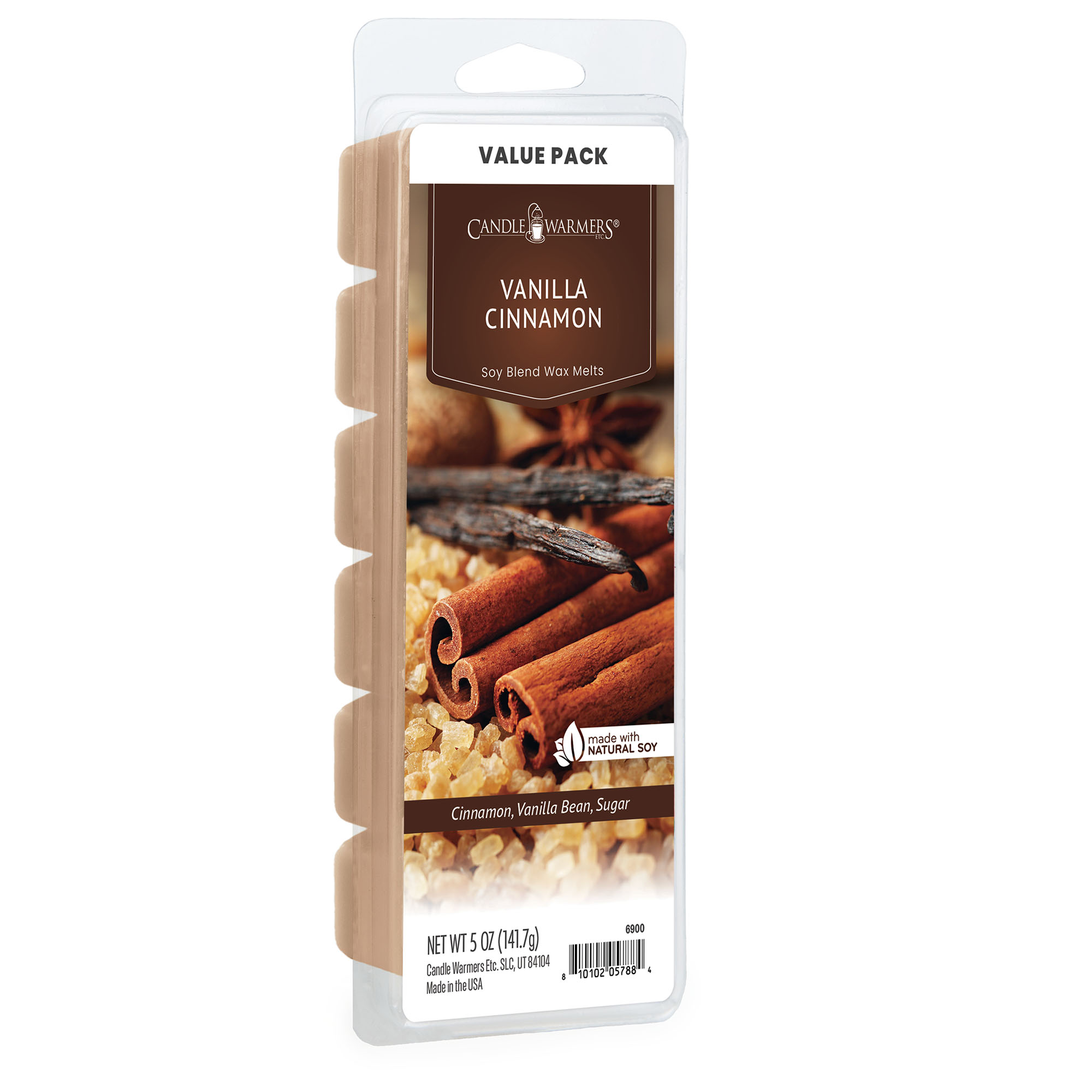 VANILLA CINNAMON FRAGRANCE: Pure vanilla bean, sweet cinnamon, and a touch of sugar. TOP NOTE: Buttery Caramel MID NOTE: Cinnamon Sugar BASE NOTE: Vanilla Cake Melts are made of soy wax, which is both biodegradable and sustainably sourced. Each 5 oz melt wax has a melt time of 60 hours. Classic Wax Fragrances contain both fine fragrances and natural ingredients. Our soy wax holds a high fragrance load and is proudly poured in the USA! Wax melts offer a no flame, no soot, no smoke sensory experience. Pair with one of our Candle Warmers Etc. Fragrance Warmers, available in a variety of styles and colors. 5 oz of wax is poured into a plastic tray that divides wax into 12 cubes. Tray can be used for wax-cooling and remelting your wax later!Specifications