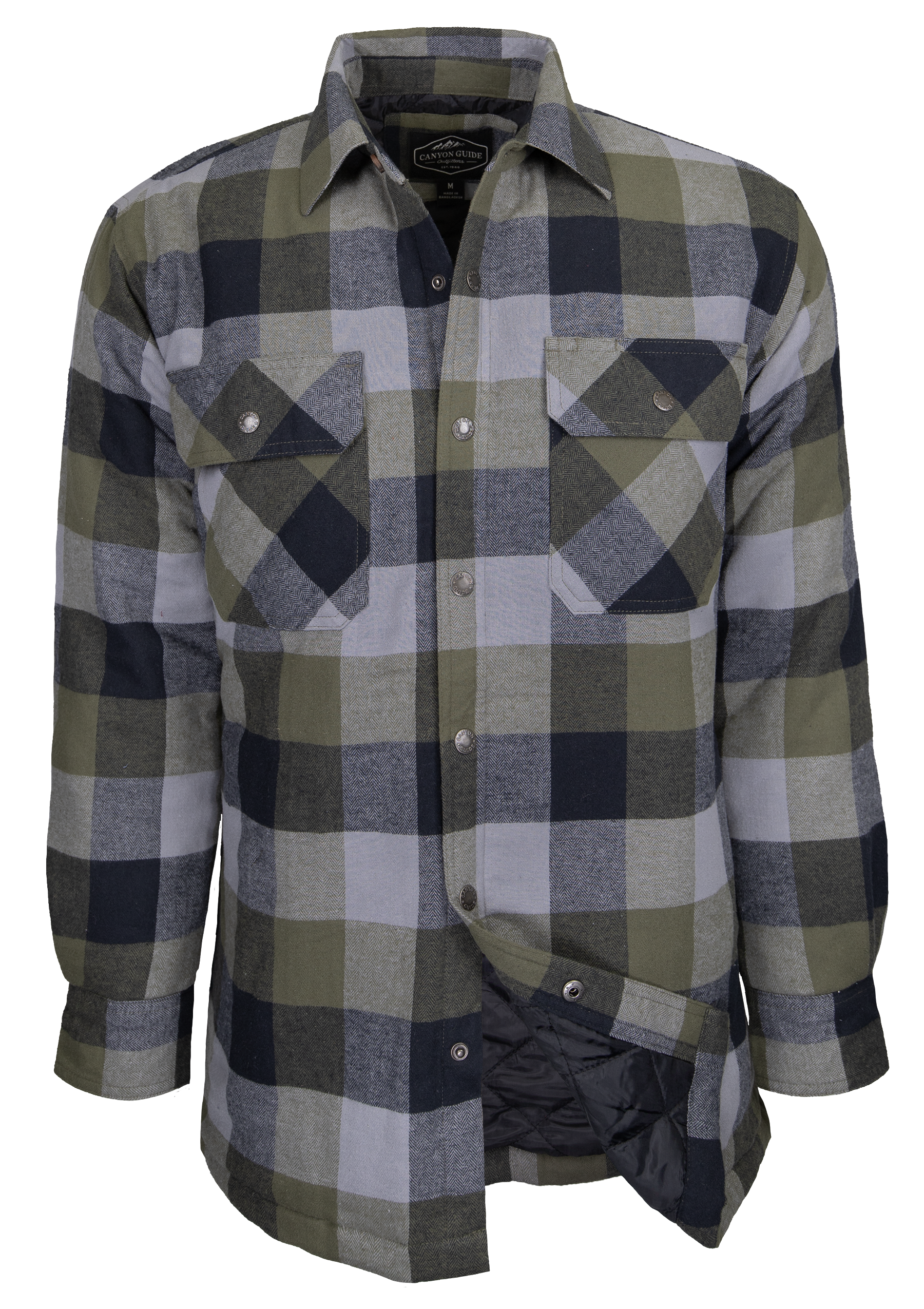 THE CANYON GUIDE SNAKE RIVER IS ONE OF OUR MORE POPULAR LINED FLANNEL SHIRT JACKETS. MADE FOR THE OUTDOOR WORKER WHO WANTS COMFORT, DURABILITY AND WARMTH. CONTSTRUCTED OF 100% COTTON FLANNEL OUTER SHELL, TWO CHEST POCKETS, TWO SIDE SEAM POCKETS AND DIAMOND QUILTED LININGSpecifications