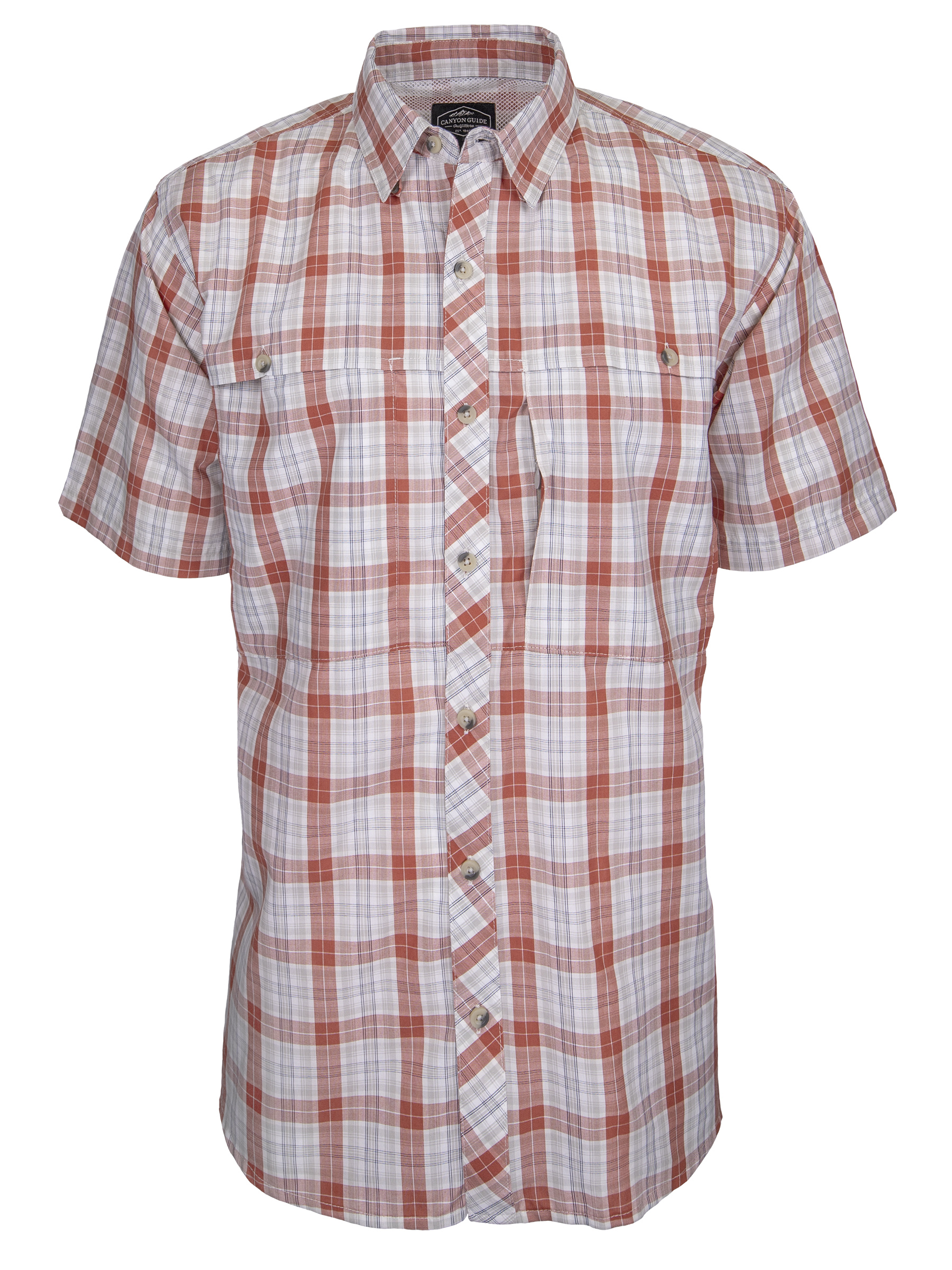 THE CANYON GUIDE MENS JEFF SHORT SLEEVE BUTTON UP SHIRT IS A WOVEN SHIRT WITH A BUTTON POINT COLLAR AND TWO CHEST POCKETS. THIS SHIRT ALSO FEATURES A HIDDEN SECURITY POCKET, AND VENTED FRONT AND BACK YOKES WITH MESH LINING TO KEEP YOU COOL AND COMFORTABLE WHETHER ADVENTURING OR RELAXING.