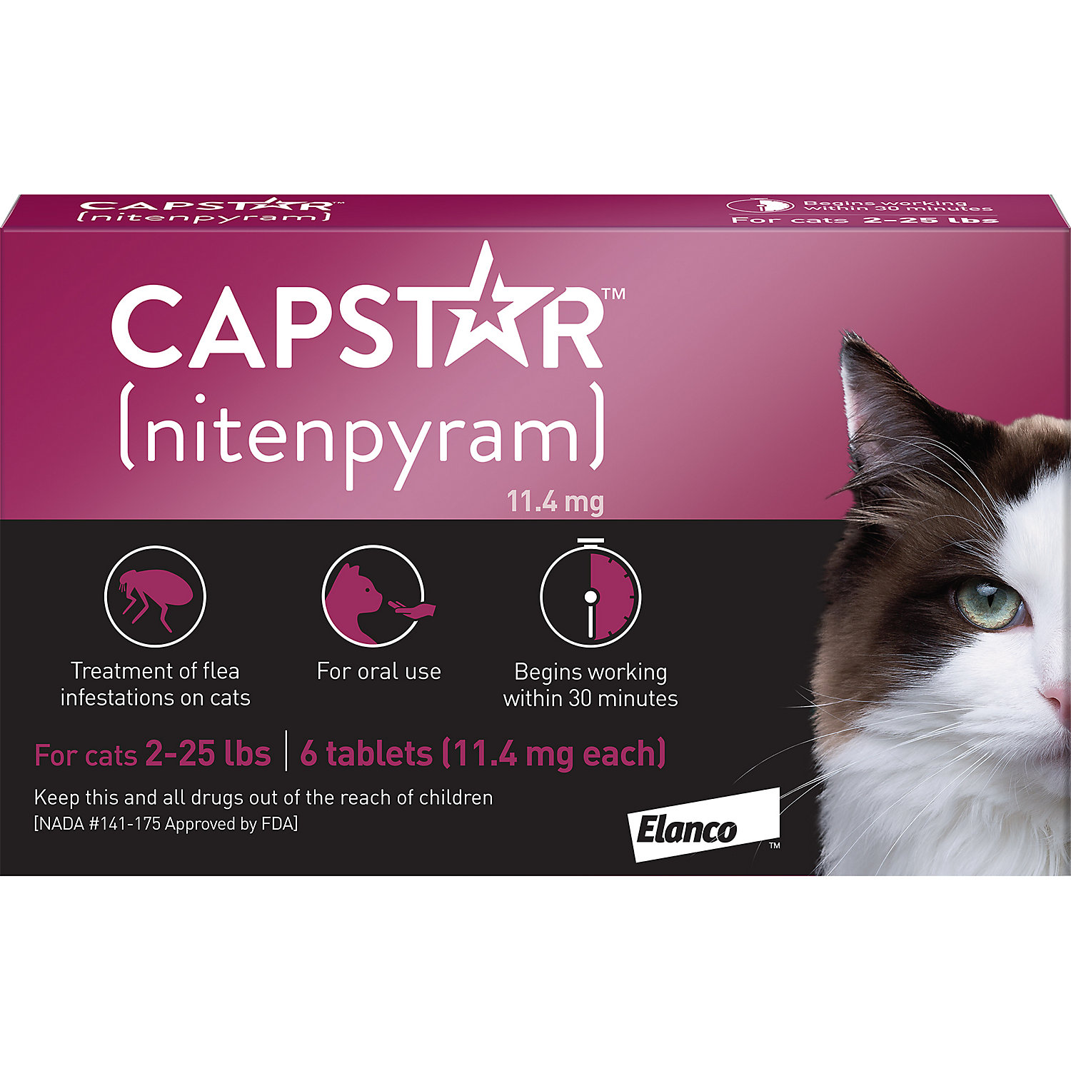 Capstar for Cats 2-25lbs The fleas on your pet are in the adult stage. An adult female flea, living on a pet, can lay up to 2,000 eggs in her lifetime. Capstar is an oral tablet for cats and kittens four weeks of age and older and two pounds of body weight or greater. It begins working in 30 minutes after treatment, killing over 90% of fleas within six hours for cats. Capstar has no labeled side effects, and can be used along with other flea-control products and medications commonly dispensed by veterinarians, including heartworm preventives, deworming products, shampoos, and antibiotics. It is eliminated from a pet's system rapidly, enhancing safety and reducing the opportunity for fleas to develop resistance.Specifications