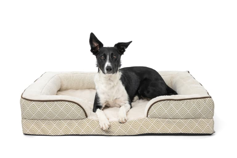 (IN STORE PURCHASE ONLY) An orthopedic pet bed with a sculptured super plush sleep surface, accented with fiber bolster wall and modern olive green print. Front opening for easy access for an older dog. Orthopedic foam supports joints & muscles, and is ideal for older dogs to help provide superior comfort.Specifications