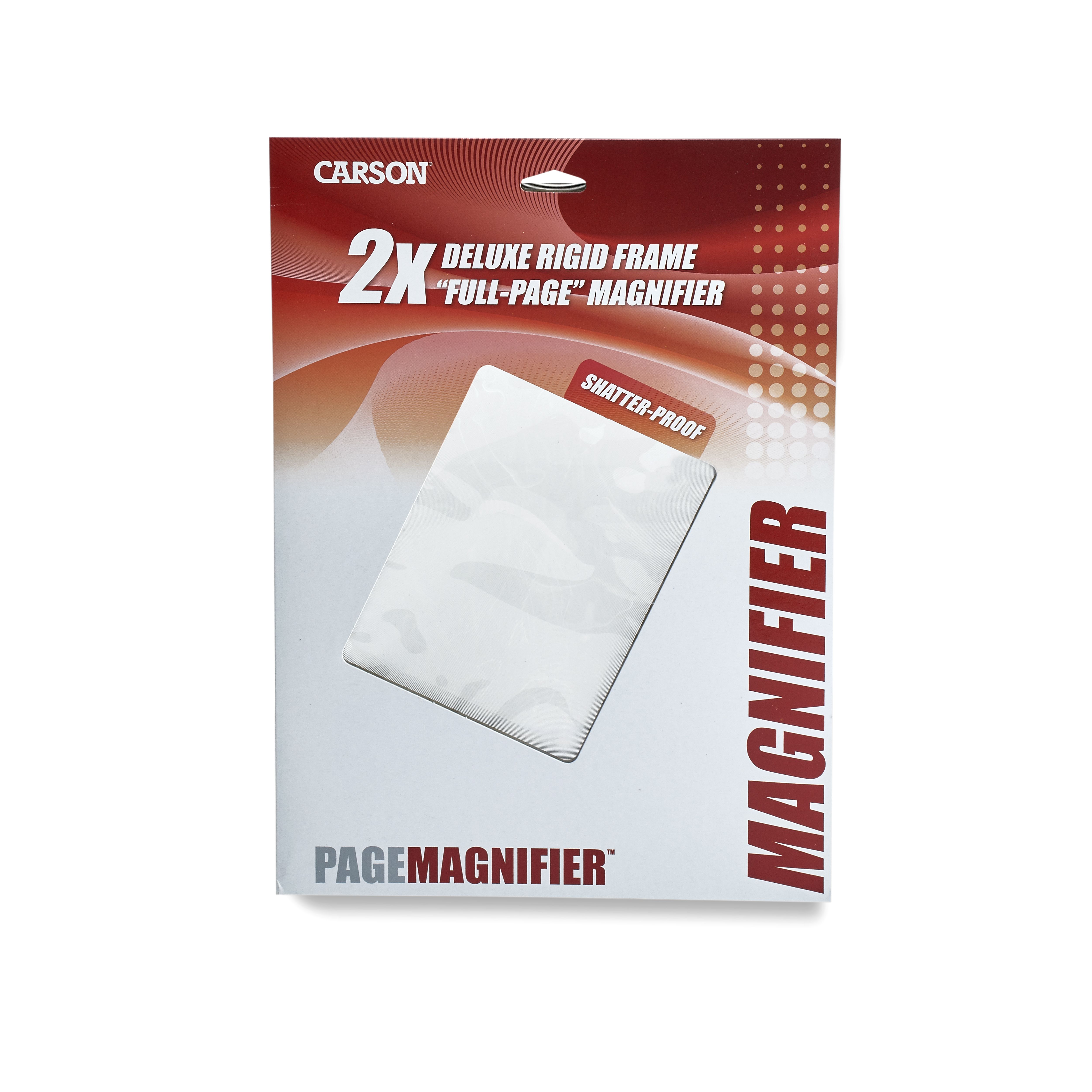 The Page Magnifier from Carson is a deluxe/ rigid frame full page magnifier. The page magnifier contains a shatter-proof 8.5 inch by 11.0 inch fresnel lens. It has a 2x power magnification which makes it great for reading wide areas of fine print on newspapers/ books/ magazines/ maps/ menus and so much more. The page magnifier has an ultra thin and lightweight design which makes it perfect to travel with. At Carson we strive to make sure our customers are 100% satisfied with the quality of our magnifiers.Specifications