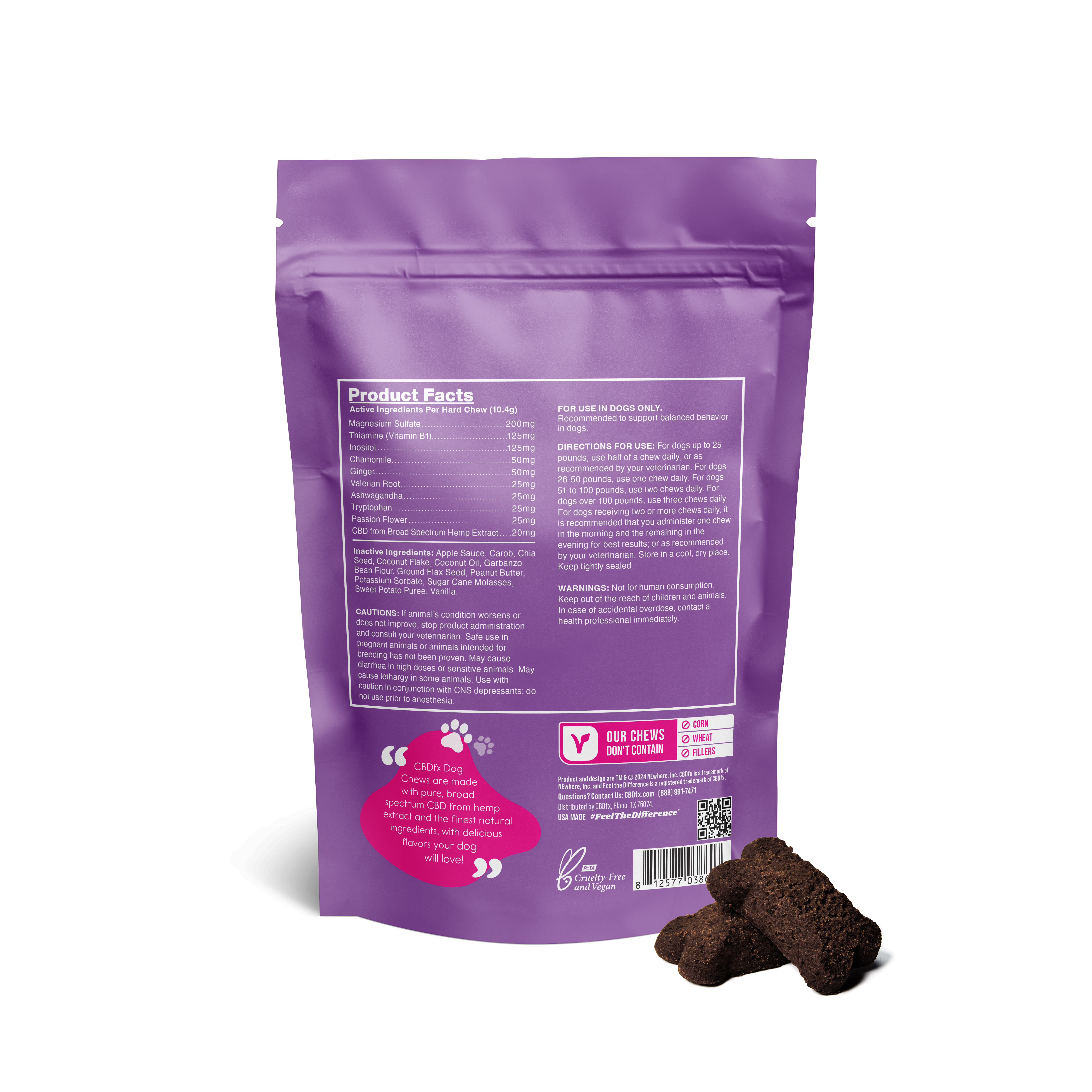 Our organic, vegan CBD dog treats are a great way to share the calming wellness benefits of CBD with your dog. Our Calming formula hard and soft chews deliver 20mg of broad spectrum CBD in every bite, plus an assortment of natural ingredients to promote blissful relaxation for your dog.The calming hard and soft chews from CBDfx are a great addition to your nervous dog’s routine. After giving them to my 15 year old dog, I saw a significant improvement in his noise phobia and separation anxiety symptoms! The tasty treats smell like a backyard BBQ, making them extremely palatable for pups. Chamomile, melatonin, valerian root, and tryptophan are touted for their homeopathic calming effect and it’s great to see them added in this supplement.Specifications