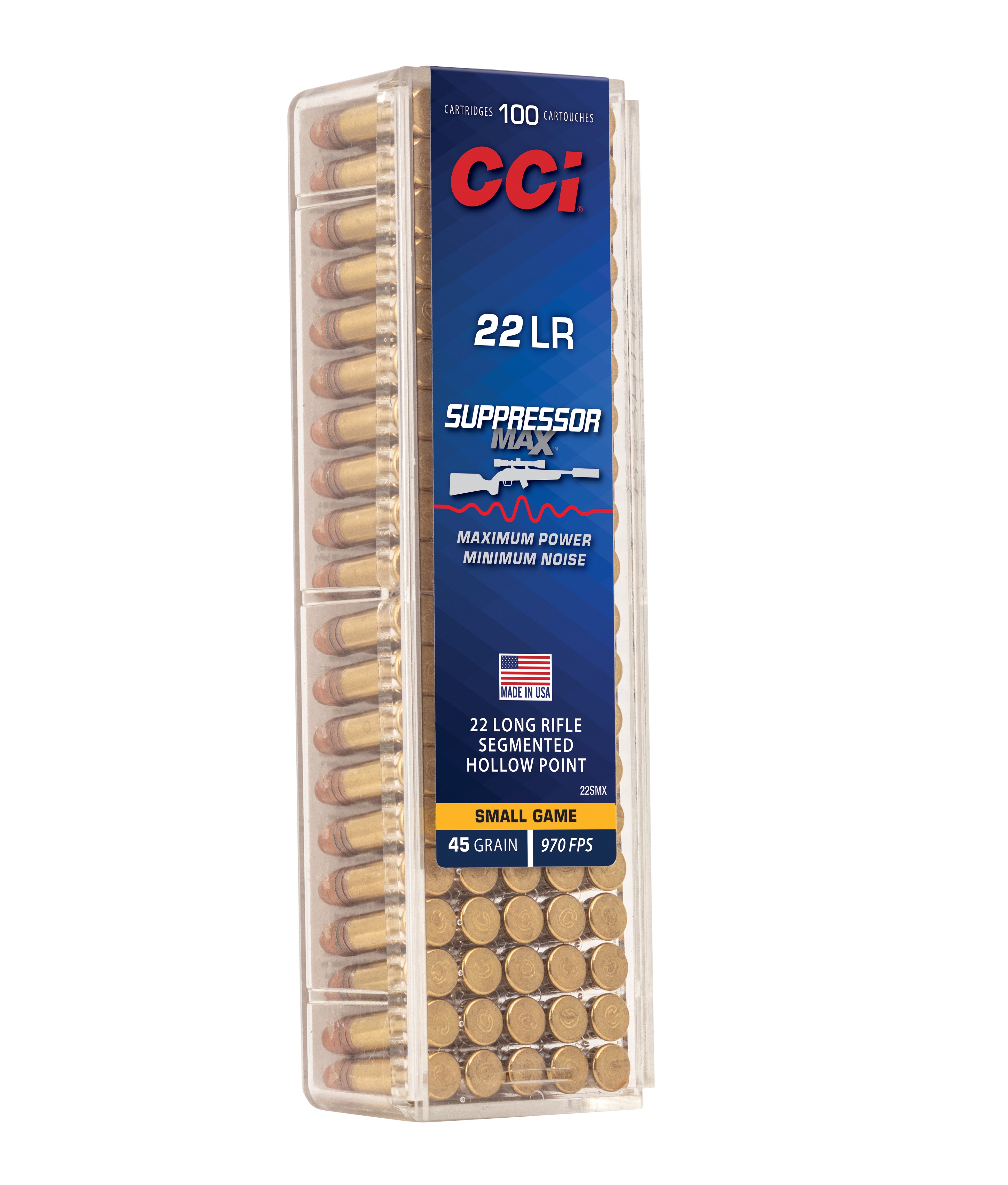 Whisper-quiet yet powerful rimfire performance is now within reach.CCI Suppressor Max is specifically designed for optimal accuracy,terminal performance and noise reduction when fired through rimfiresuppressors. The specialized hollow-point bullet ensures effectivesegmentation on impacteven at its low-decibel, sub-sonic 970 fpsmuzzle velocity.Specifications