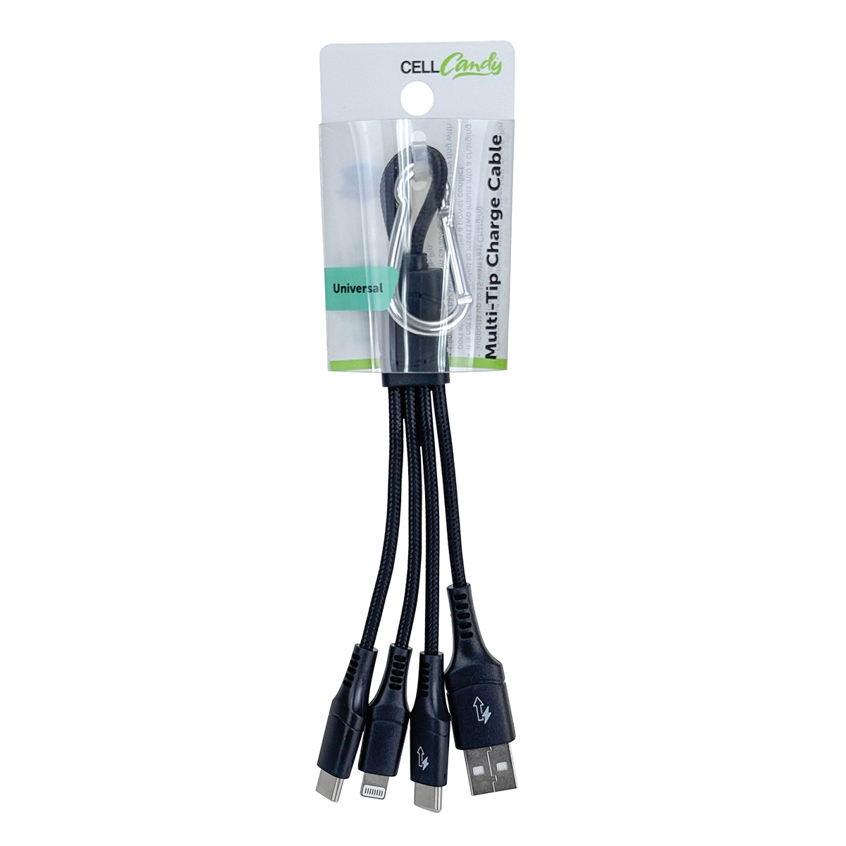One Cable. All Devices. Total Convenience. Say goodbye to cable clutter and stay charged no matter where life takes you with the 4-in-1 Clip Charger. Featuring a smart, compact design and four versatile connectors: USB-A, USB-C (input), USB-C (output), and 8-Pin (Lightning). This all-in-one charging solution is your new go-to for powering virtually any device. From iPhones to Androids, tablets to wireless earbuds, this cable has you covered. Keep it clipped to your keys, backpack, or bag for fast charging and syncing on the go. Charge everything, anywhere! Designed with multi-device households and fast-paced lives in mind, this cable includes USB-A for legacy charging blocks and car ports, USB-C input for modern adapters, power banks, and laptops, USB-C output for Android phones, tablets, headphones, and more, and 8-Pin Lightning output for iPhones, iPads, AirPods, and other Apple devices. Charge multiple devices across platforms with one sleek cable; no need to carry different cords. The innovative carabiner feature makes portability a breeze. Attach it to your bag, keychain, or lanyard and always have a charger within reach. Small in size but big on functionality, this is the travel companion you’ll never leave behind. Supports fast charging and data transfer (when used with compatible adapters and devices). Whether you’re transferring photos, topping off your phone before a meeting, or charging on a road trip, the 4-in-1 Clip Charger delivers solid performance with universal capability. Whether you're headed to class, the office, or the airport, this cable ensures you’re always prepared. It fits easily in your pocket or bag, and its all-in-one design means fewer cables to forget or untangle. Made with high-quality materials, the 4-in-1 Clip Charger is built to last. Reinforced connectors and a tangle-resistant jacket ensure long-term durability. Internal smart chip tech protects your devices from overcharging and short-circuiting. From your iPhone to your Android, your earbuds to your tablet, the 4-in-1 Clip Charger powers it all. Compact, stylish, and incredibly functionalthis is the only cable you’ll ever need. Charge smarter. Travel lighter. Stay connected.Specifications