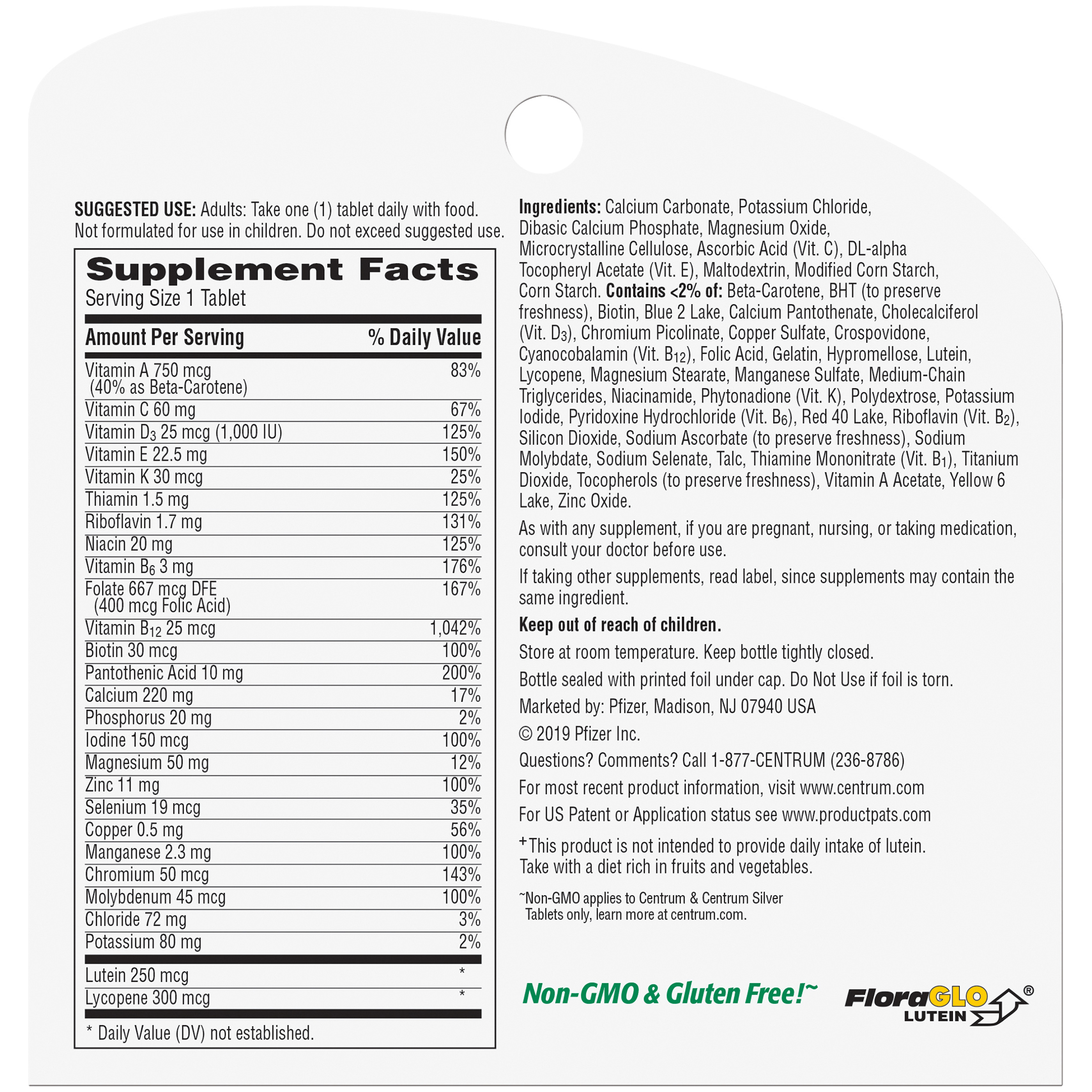 Centrum Silver Multivitamin for Adults 50 Plus brings you a personalized senior multivitamin/multimineral supplement that contains micronutrients to nourish your cells and help support full body wellness. This brain health supplement contains essential nutrients, including vitamin D and calcium to support strong bones, B vitamins to help promote heart health, zinc to support normal brain function, and lutein and vitamins A, C, and E to help support healthy eyes. Key micronutrients in these heart health supplements help fill in nutritional gaps to promote overall wellness and vitality. This multivitamin for men and women is verified non GMO and gluten free to appeal to a variety of dietary preferences. Centrum Silver men's and women's multivitamin tablets feature a smooth coating that makes them easy to swallow. Simply take one tablet daily to replenish your body with essential vitamins and minerals that support your energy, immune system and metabolism. Multivitamins are part of an overall healthy lifestyle and can help adults get the recommended amount of key vitamins and minerals. Help support your body head-to-toe with Centrum, the #1 doctor and pharmacist recommended brand.Specifications