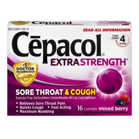 Get fast acting sore throat relief with honey lemon flavored Cepacol. Our soothing lozenges provide maximum strength relief to alleviate your sore throat pain and help you feel better.Cepacol Sore Throat & CoughTEMPORARILY RELIEVES THE FOLLOWING SYMPTOMS:Sore throatSore mouthMinor mouth irritationPain from canker soresCoughPowerful Sore Throat Relief That LastsCepacol Sore Throat & Cough does double duty to provide powerful, instant-acting sore throat relief while suppressing cough.#1 Sore Throat Lozenge BrandCepacol is the #1 lozenge brand and is there to help you feel better fast. Sore throats can be painful, dry, or accompanied by an irritating cough. There are a variety of Cepacol lozenges available to help soothe different sore throat needs. Scroll down to chart to view your options.Works Instantly to Numb Sore Throat PainSore throats can be painful, irritating, and in need of fast relief. Nothing is stronger to relieve sore throat pain than Cepacol Lozenges and Spray. Cepacol works instantly to numb sore throat pain.Specifications