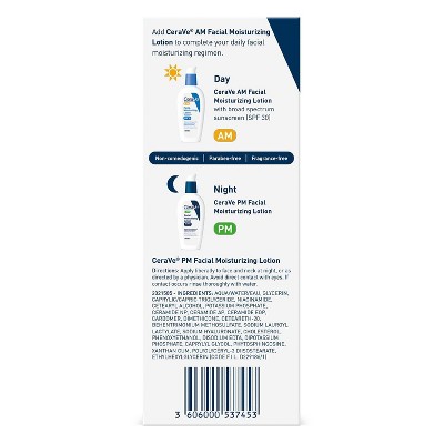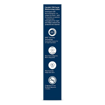 Developed with dermatologists, CeraVe PM Facial Moisturizer is formulated to lock in your skin’s moisture and help restore its natural barrier -- all while you sleep. Adding this oil-free, non-comedogenic night cream to your nighttime skincare routine can help hydrate, calm, and soothe your skin while also helping to maintain your protective skin barrier. Featuring niacinamide, hyaluronic acid, and three essential ceramides, this night cream uses our MVE technology to deliver a steady stream of much-needed moisture throughout the night, and offers an effective, yet gentle way to care for your normal to oily skin.Specifications