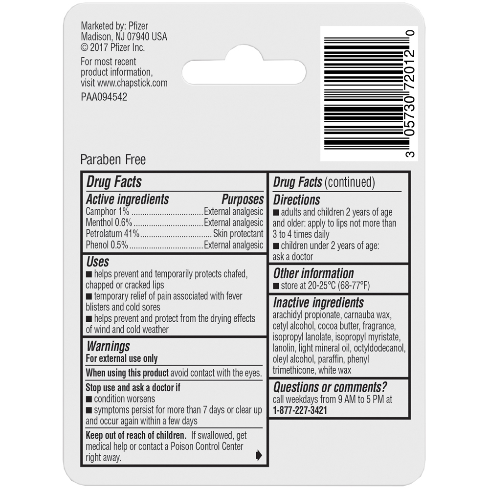 When it comes to caring for your lips, you can't go wrong with a classic. And when you need extra care and protection for severely chapped lips, ChapStick Classic Medicated Skin Protectant is the one you want. ChapStick Classic Medicated lip balm is specially formulated to help treat severely dry and chapped lips. It contains Camphor and cooling Menthol to help soothe cracked skin, plus Phenol to help relieve pain as lips heal. Through every season, at home or on the go, trust ChapStick Classic Medicated lip balm for comforting, healing lip care.Specifications