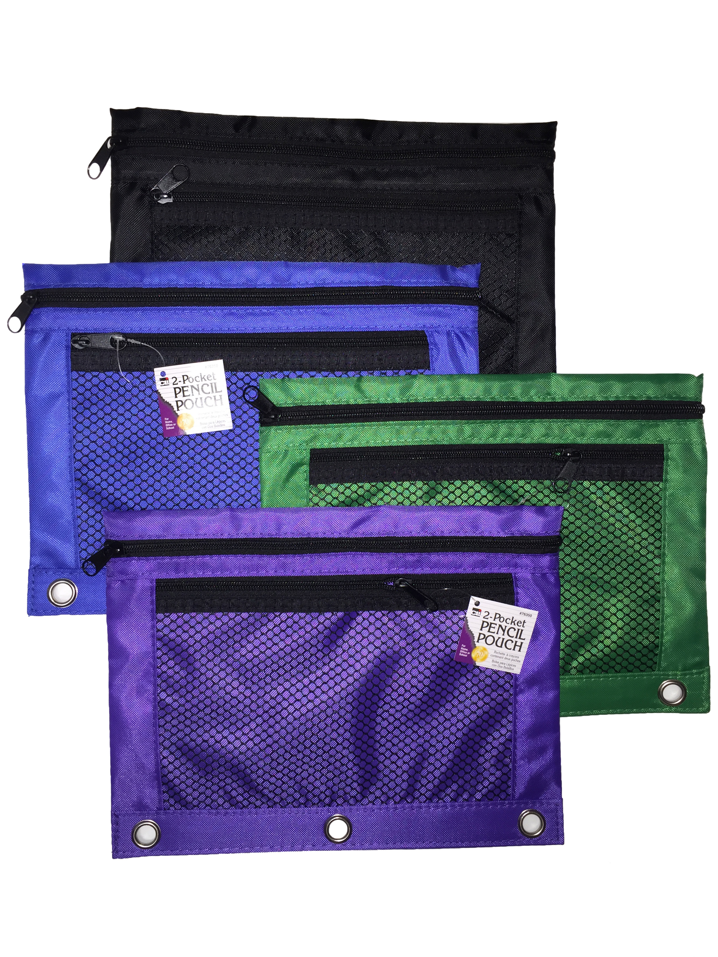 Double pocket pencil pouch, has a mesh front for easy viewing. Fits easily into a 3 ring binder and has reinforced grommet holes. Durable construction for long lasting use. Assorted ColorsSpecifications