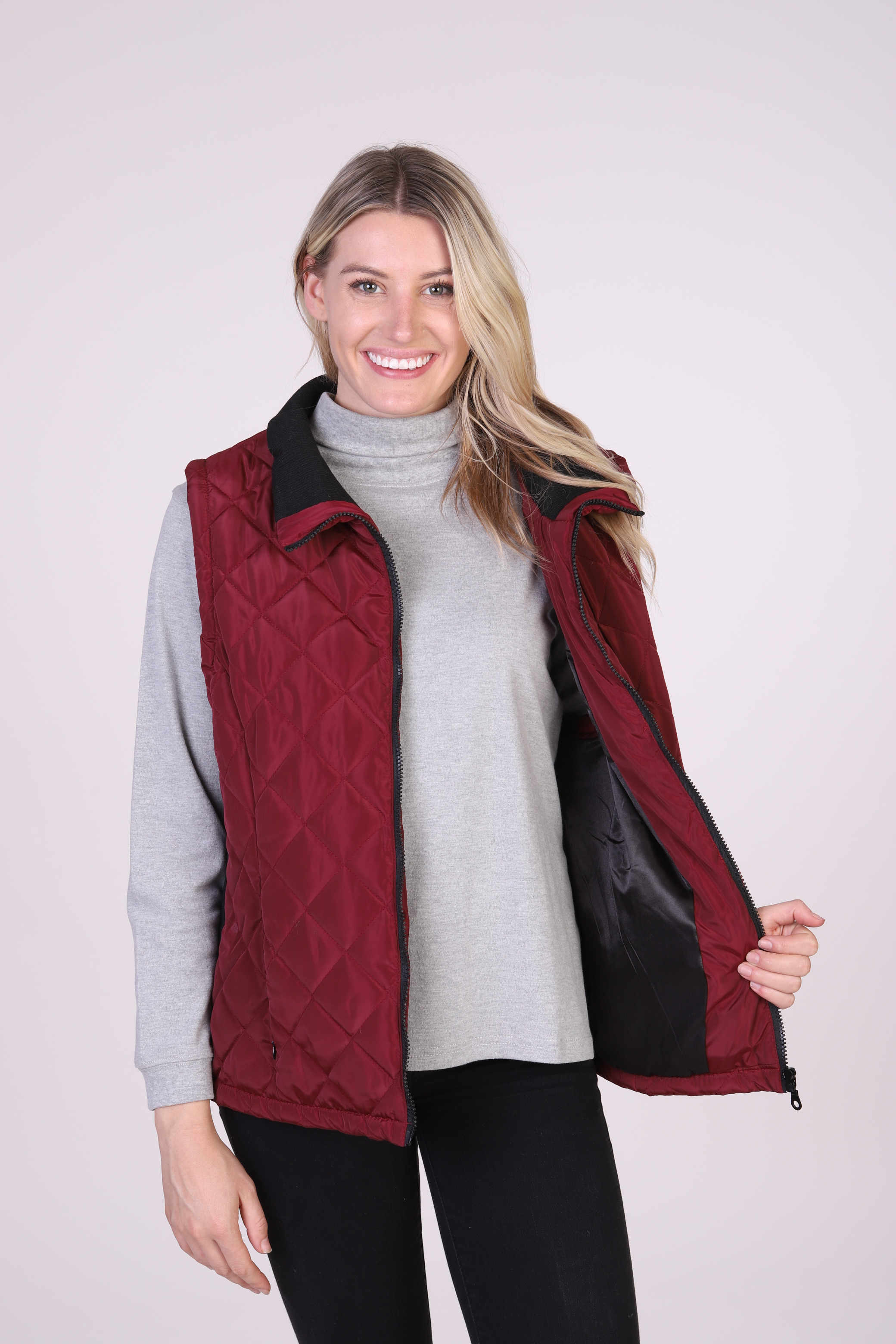 WOMEN'S 100% WATER RESISTANT QUILTED POLYESTER ZIPPER FRONT VEST WITH POLY FILLED POLY LINING AND RIB KNIT UNDER ARM SIDE TRIM IN CONTRAST COLOR. COLORS AVAILABLE: BLACK W/BLACK TRIM AND BURGUNDY W/BLACK TRIM. SIZE RUN M-2XL. MACHINE WASH/DRY. IMPORTED.Specifications