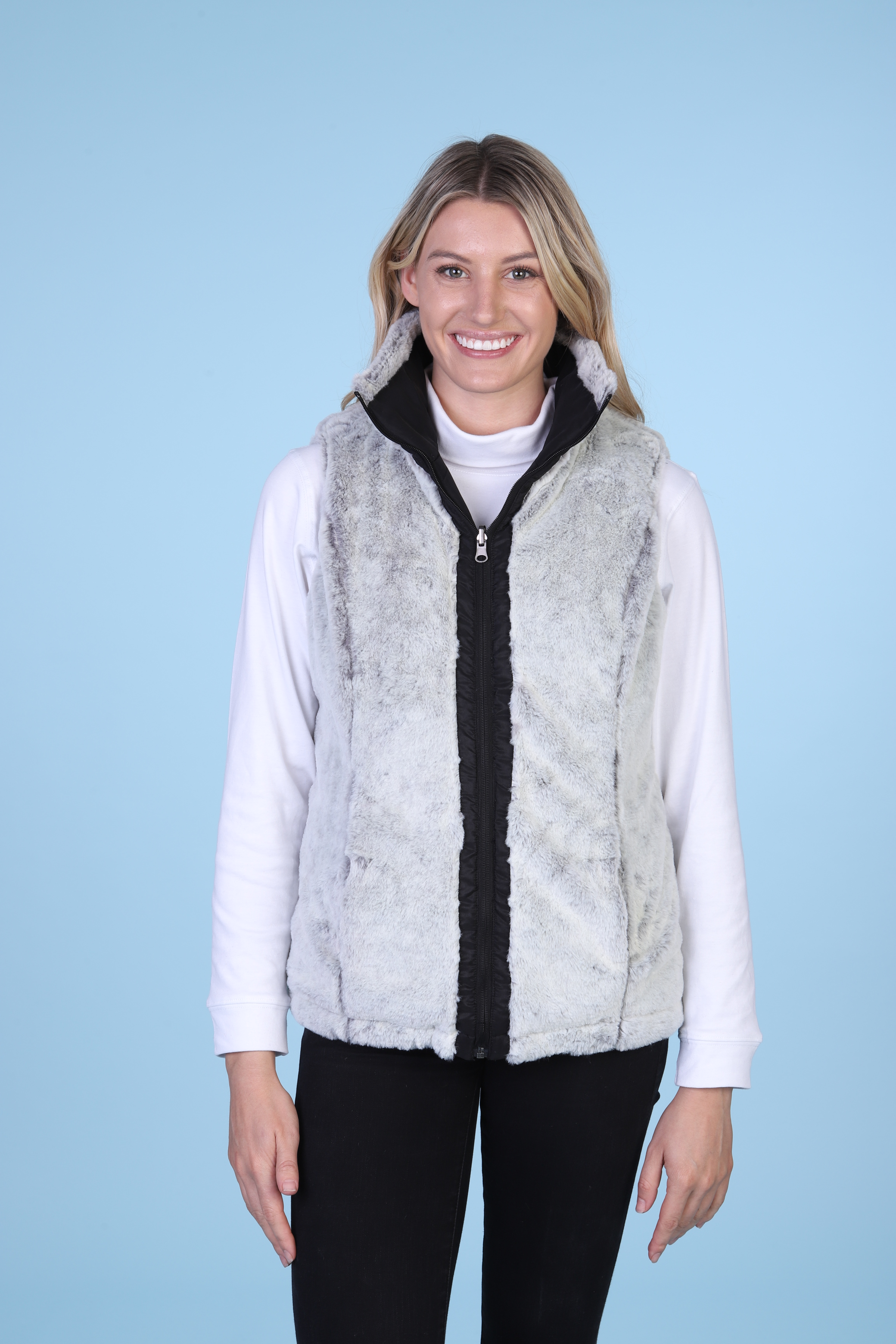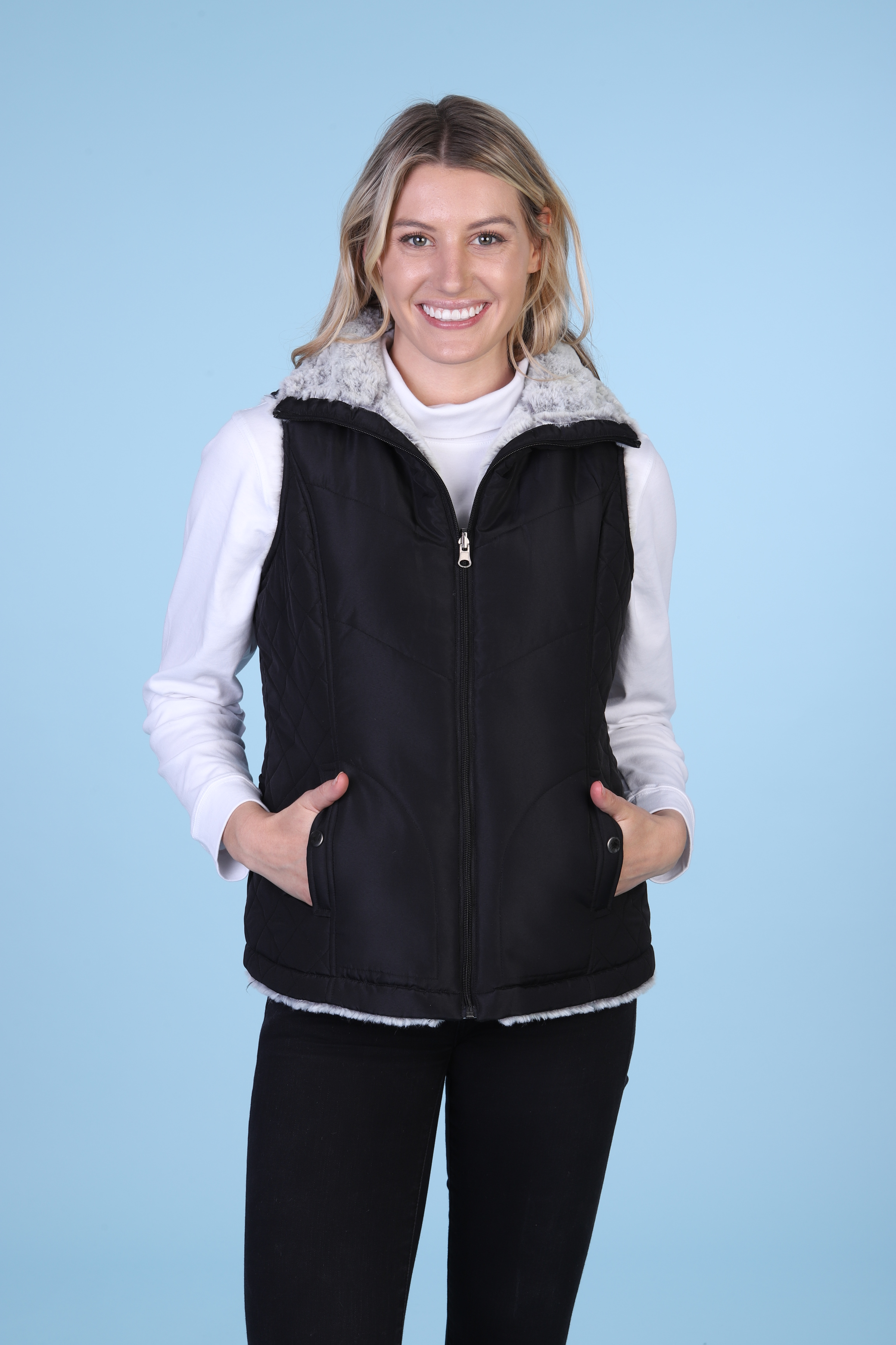 WOMEN'S REVERSIBLE SOFT PILE FUR LINED FULL ZIPPER NYLON VEST. 2-SNAP CLOSURE HAND POCKETS. DIAMOND QUILTED SHELL. FUR TRIMMED STAND-UP COLLAR. COLORS AVAILABLE IN BLACK & BURGUNDY. SIZE RUN M-2XL. MACHINE WASH COLD/GENTLE DRY. IMPORTED.Specifications