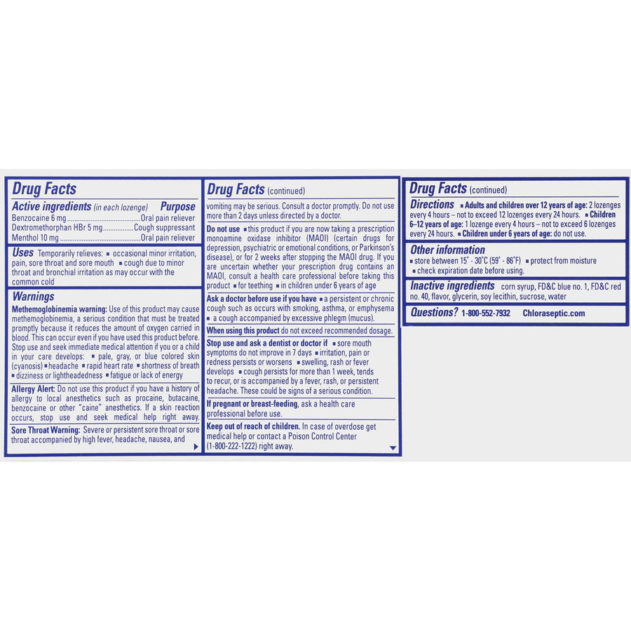 Quickly relieve your sore throat pain and cough with a Wild Cherry, Multi Symptom Formula lozenge.Provides fast-acting relief of sore throat and mouth painTotal multi-symptom formula with an extra soothing liquid center - relieves pain, suppresses cough up to 4 hours and cools nasal passagesChloraseptic lozenges contain benzocaine which temporarily relieves minor irritation, pain, sore mouth and throat. Chloraseptic, when used as directed, provides safe, effective and fast relief.Note: Please refer to the WARNINGS provided on Chloraseptic website for important information on the safe use of benzocaine containing oral care products.Specifications