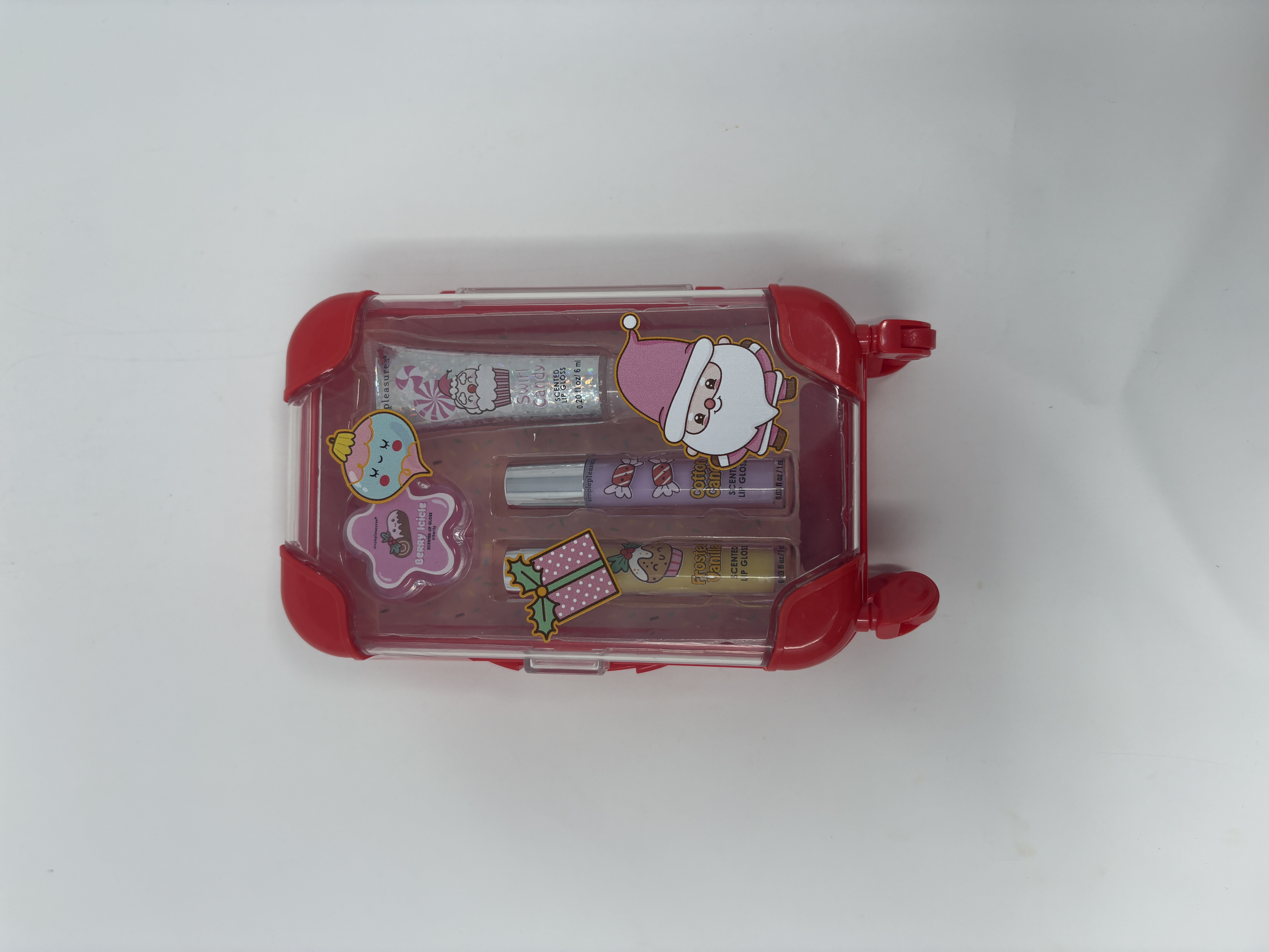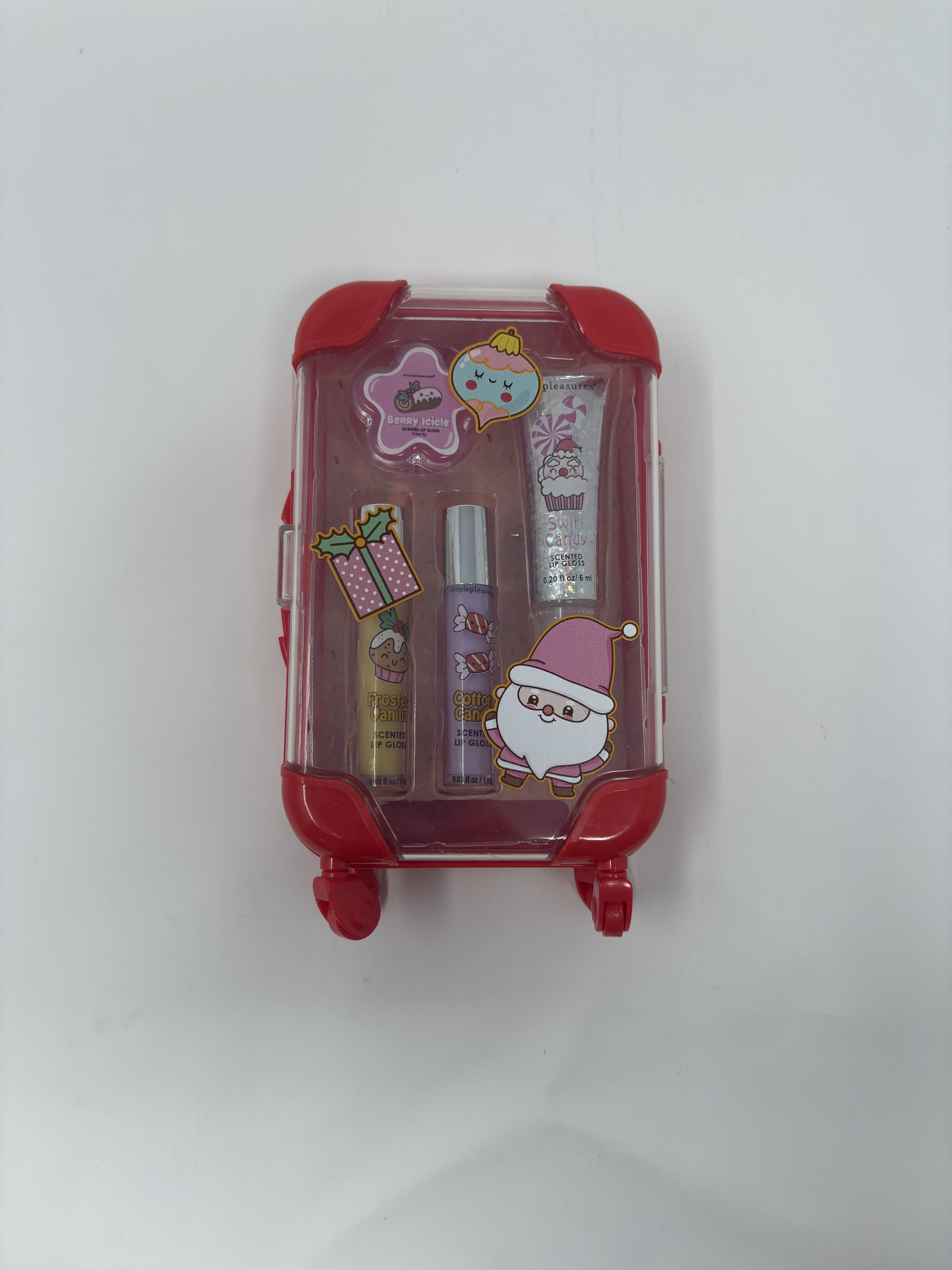 This is a mini suicase set. It is Christmas themed and contains 4 different types of lip gloss. Flavors included are berry isicle, cotton candy and frosted vanilla. This is a great stocking stuffer and a great gift for the holiday season.Specifications