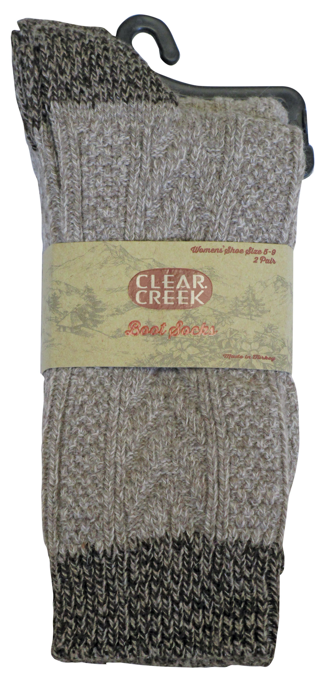 CLEAR CREEK WOMENS WOOL BOOT SOCK FEATURES A CREW LENGTH MARLED DESIGN AND WOOL BLEND MATERIAL. THESE ARE THE PERFECT BOOT SOCKS FOR THE FALL AND WINTER SEASONS.Specifications