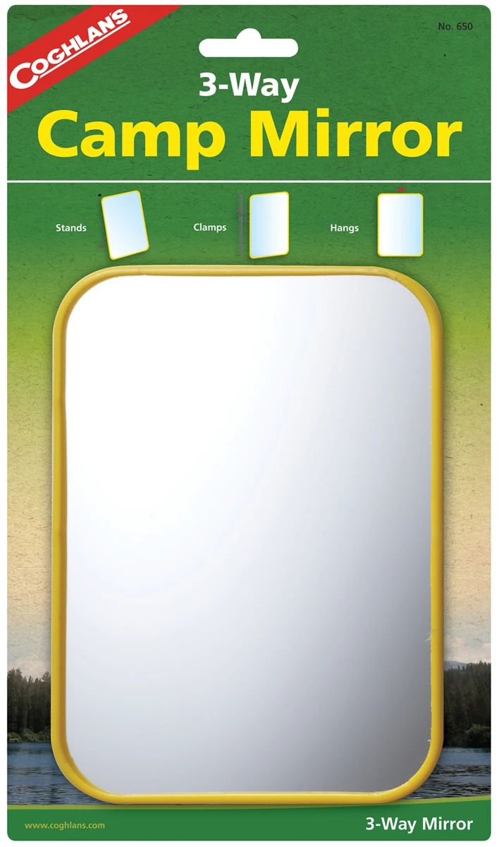 5" X 7" quality mirror in sturdy, colorful plastic frame. Unique metal hook on back enables mirror to stand - clamp on pole or hang. Handy for, trailers, tent trailers, summer cottage or home.Specifications