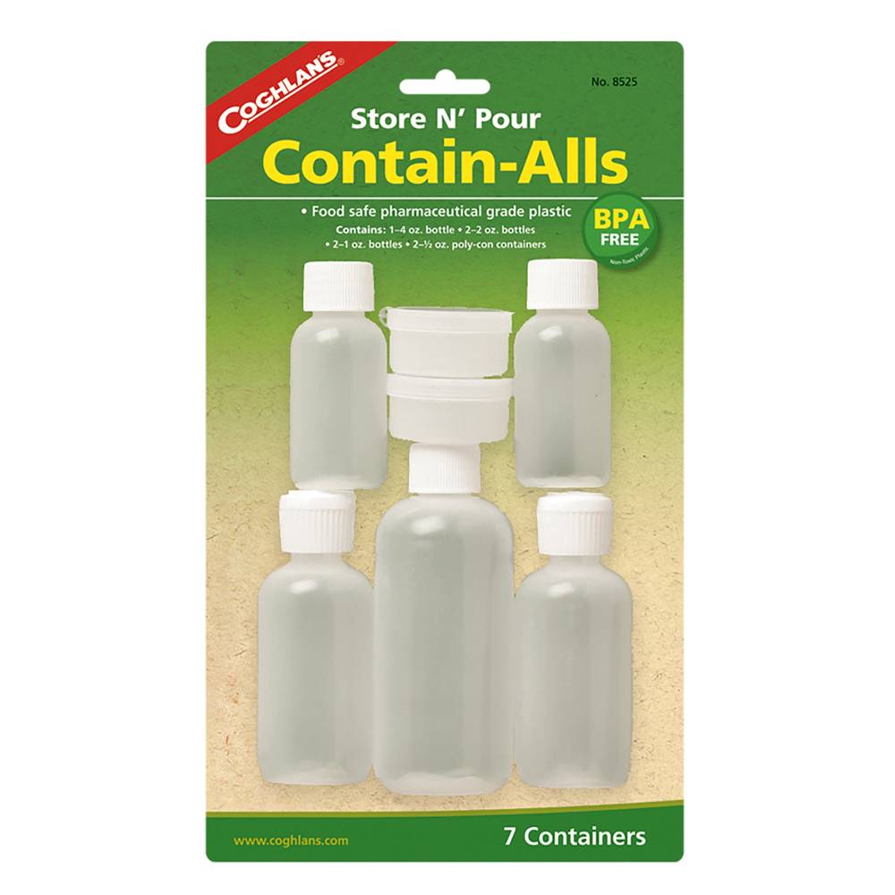 7 lightweight and flexible food safe containers for every pourable liquid or solid such as instant coffee, cooking oil, pills, lotion, etc Set Includes:1 - 4 oz. Bottle, 2 - 2 oz. Bottles, 2 - 1 oz. Bottles, 2 - 1/2 oz. Polycontainers.Specifications
