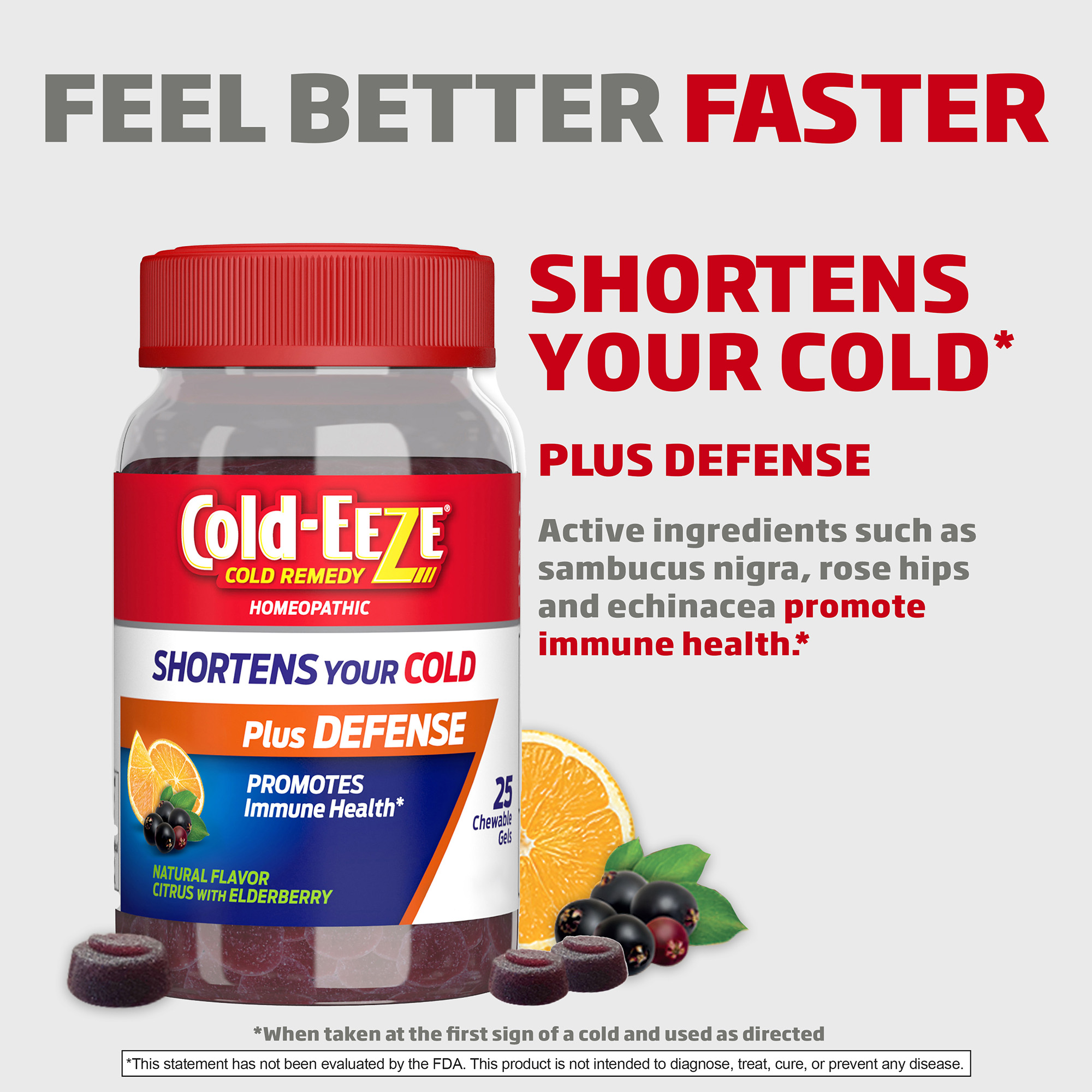 Cold-EEZE Plus Defense Natural Citrus with Elderberry Zinc Chewable Gels, Homeopathic Cold Remedy, Shortens Common Cold Symptoms, Promotes Immune Health with Sambucus Nigra, Echinacea & Rose Hips, 25 CtCold-EEZE is the original and #1 best-selling zinc lozenge brand, that can help shorten the duration of your cold by 42%, when taken at the first sign of symptoms and used as directed. Our proprietary zinc gluconate formula contains 13.3 mg of zinc per chewable gel which also reduces the severity of cold symptoms including cough, sore throat, nasal congestion, post nasal drip, and/or hoarseness. Our Plus Defense chewable gels and lozenges also contain sambucus nigra, rose hips, and echinacea to help promote immune health. Our popular zinc cold remedy chewable gel in citrus with elderberry flavor is great-tasting and is easy to chew, vegan, kosher, and free from artificial colors and preservatives. Our zinc lozenges and chewable gels are also gluten-free, soy-free, dairy-free, peanut-free, drug-free, and non-drowsy. Also try our Zinc Plus Cold + Flu products that can shorten your cold and deliver additional benefits to relieve your cold and flu symptoms including cough, nasal congestion, irritated respiratory tract, and an irritated throat. Shorten your cold with Cold-EEZE. Active ingredient is in the official Homeopathic Pharmacopoeia of the United States. Claims based on traditional homeopathic practice, not accepted medical evidence. These statements have not been evaluated by the FDA. This product is not intended to diagnose, treat, cure or prevent any disease.Based on unit sales of cold shortening homeopathic zinc lozenges.Specifications