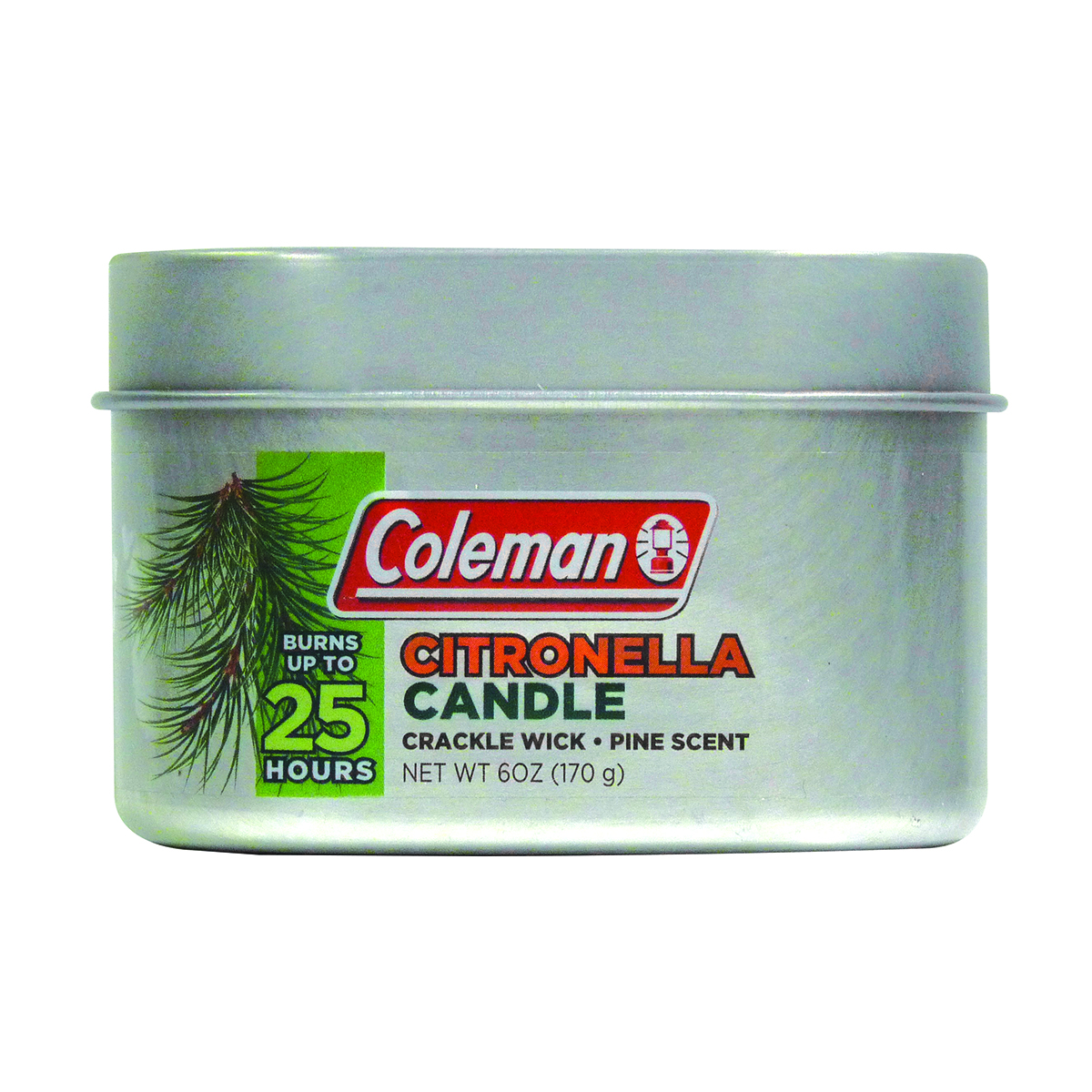 Enjoy the camping experience minus the bugs with the Coleman Pine Scented Citronella Candle with 25 Hour Crackle Wick. This Coleman wood wick candle smells like a real wood campfire and even has a crackling sound, so you can enjoy camping ambiance anywhere. The retro embossed tin is 100% recyclable. The Coleman Pine Scented Citronella Candle repels insects and burns up to 25 hours with a crackling wooden wick.Specifications