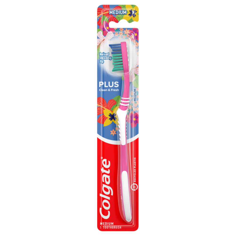 cleaning-tip that reaches and cleans back teeth and a tongue; Colgate Plus manual toothbrush; Provides an effective clean