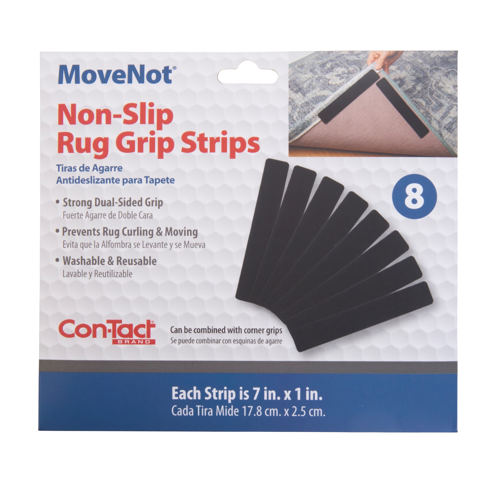These CON-TACT Brand MoveNot non-slip rug grip strips will help hold for mats and throw rugs in place on solid surface floors. The grip strips feature dual-sided grip with self-adhesive on both sides of the strip. They help present curling and moving of the rug. Each strip measures 7 inches in length and 1 inch in width. There are 8 strip per package. They are black in color.Specifications