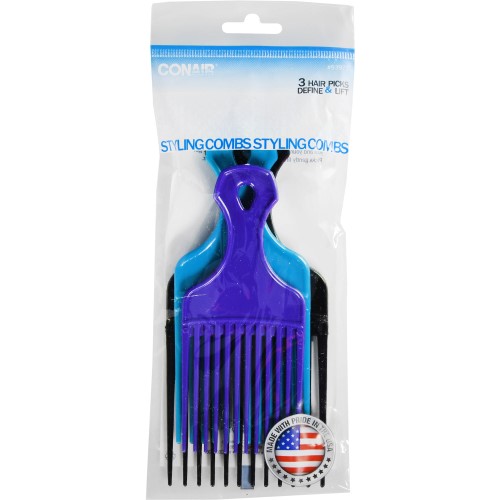 Easily style your hair with these Conair 3-Pack Pick Combs. They come in three different colors. These Conair combs can be used to define and lift hair.Conair 3-Pack Pick Combs:.Specifications