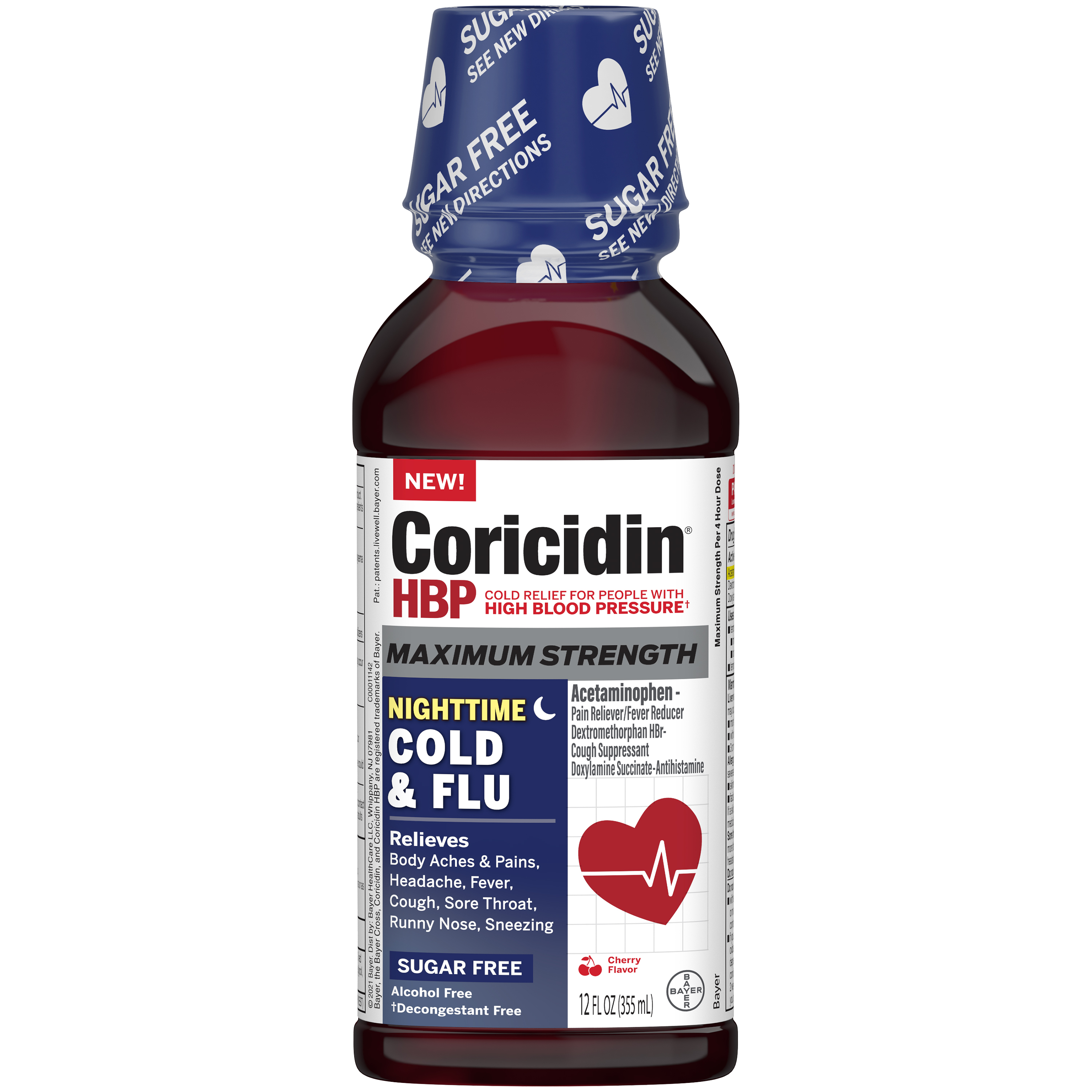 Coricidin HBP Sugar Free Nighttime Multi Symptom Cold Relief Liquid temporarily relieves common cold/flu symptoms: headache, sore throat, runny nose, minor aches and pains, cough die to minor throat and bronchial irritation, sneezing, fever. It is decongestant-free. Cold relief for people with high blood pressure.Specifications