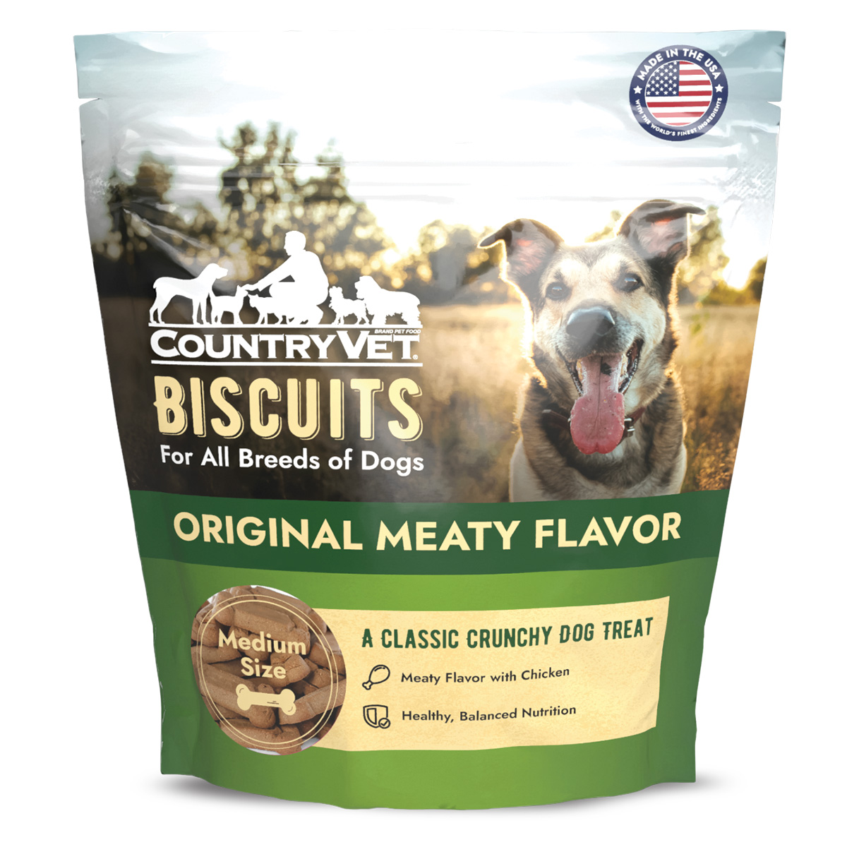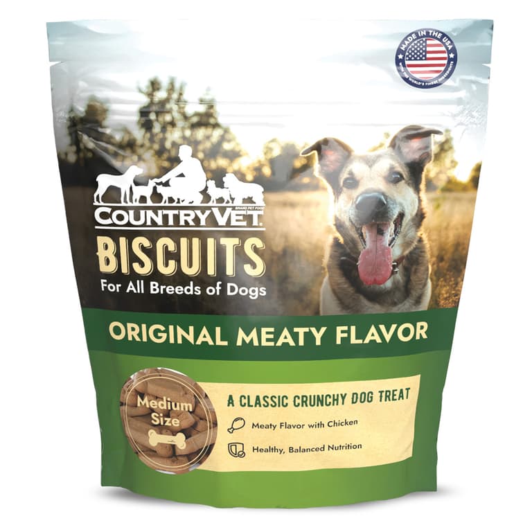 Original flavored Country Vet biscuits for large dogs. A taste that dogs love in a wholesome treat that contains vitamins and minerals.Each biscuit contains Omega 6 and Omega 3 fatty acids. Your best friend is eating a formula that is good for them. The crunchy texture helps to maintain clean teeth. These quality biscuits are manufactured in a Safe Feed/Safe Food facility. Made in USA.Specifications