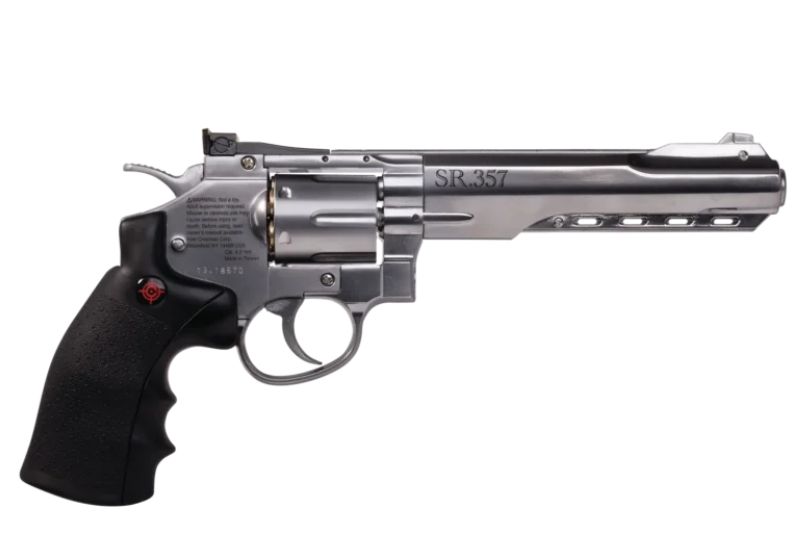 The Crosman SR357 BB Revolver is a sleek, powerful CO2-powered airgun that replicates the look and feel of a real revolver. Designed for enthusiasts and target shooters, this 6-shot, semi-automatic BB gun delivers impressive performance with its 4.5mm steel BBs. The SR357 features a full metal body, providing a realistic weight and feel, while the ergonomic grip ensures comfortable handling for accurate shots. Powered by a 12g CO2 cartridge, this BB revolver offers consistent velocity and reliable performance with each shot. Whether you’re looking for precision target practice or adding to your collection, the Crosman SR357 delivers both style and functionality.Specifications