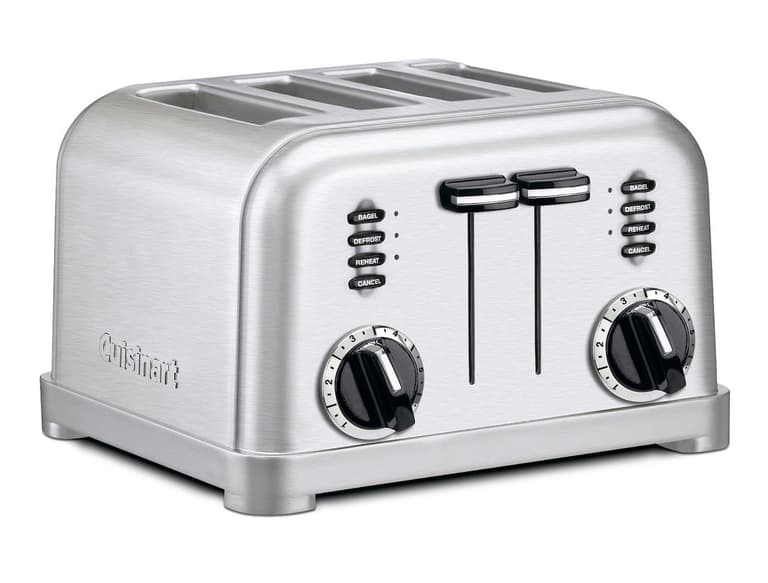 Our Metal Classic 4-Slice Toaster delivers innovative looks and spectacular performance. Two control panels each toast two items at a time, to any shade you want. That means you can toast thick sliced breads at the same time you're doing bagels! Features two 6-setting Browning Dials and dual Bagel, Reheat and Defrost Controls with LED indicators. The Beauty of Stainless SteelPerfect Toast with Perfect Style. Bring the classical beauty and powerful performance of the Cuisinart home with this timeless classic. A blending of stainless steel and black painted steel makes this toaster a must have for those who desire classical culinary design.Specifications