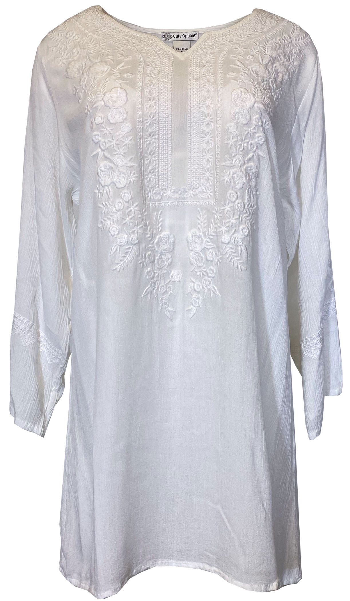 CUTE OPTIONS WOMENS 3/4 SLEEVE TUNIC IS THE PERFECT TOP WITH GORGEOUS EMBROIDERY IN MULTIPLE COLORS ON A V SHAPED NECKLINE.Specifications