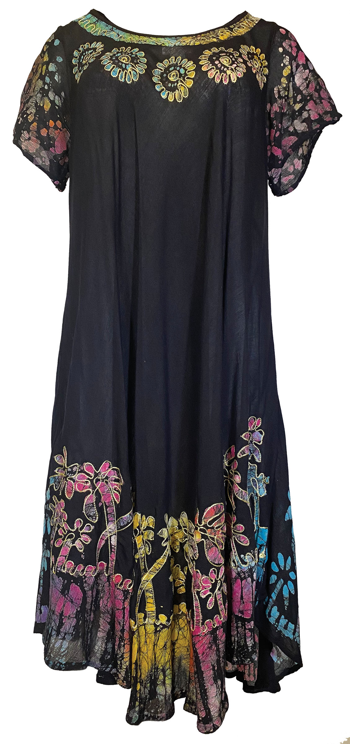 CUTE OPTIONS WOMENS BATIK SHORT SLEEVE DRESS FEATURES A BEAUTIFUL MULTICOLOR HAND BATIK WITH EMBROIDERY. THIS IS A GORGEOUS DRESS FOR SUMMER.Specifications