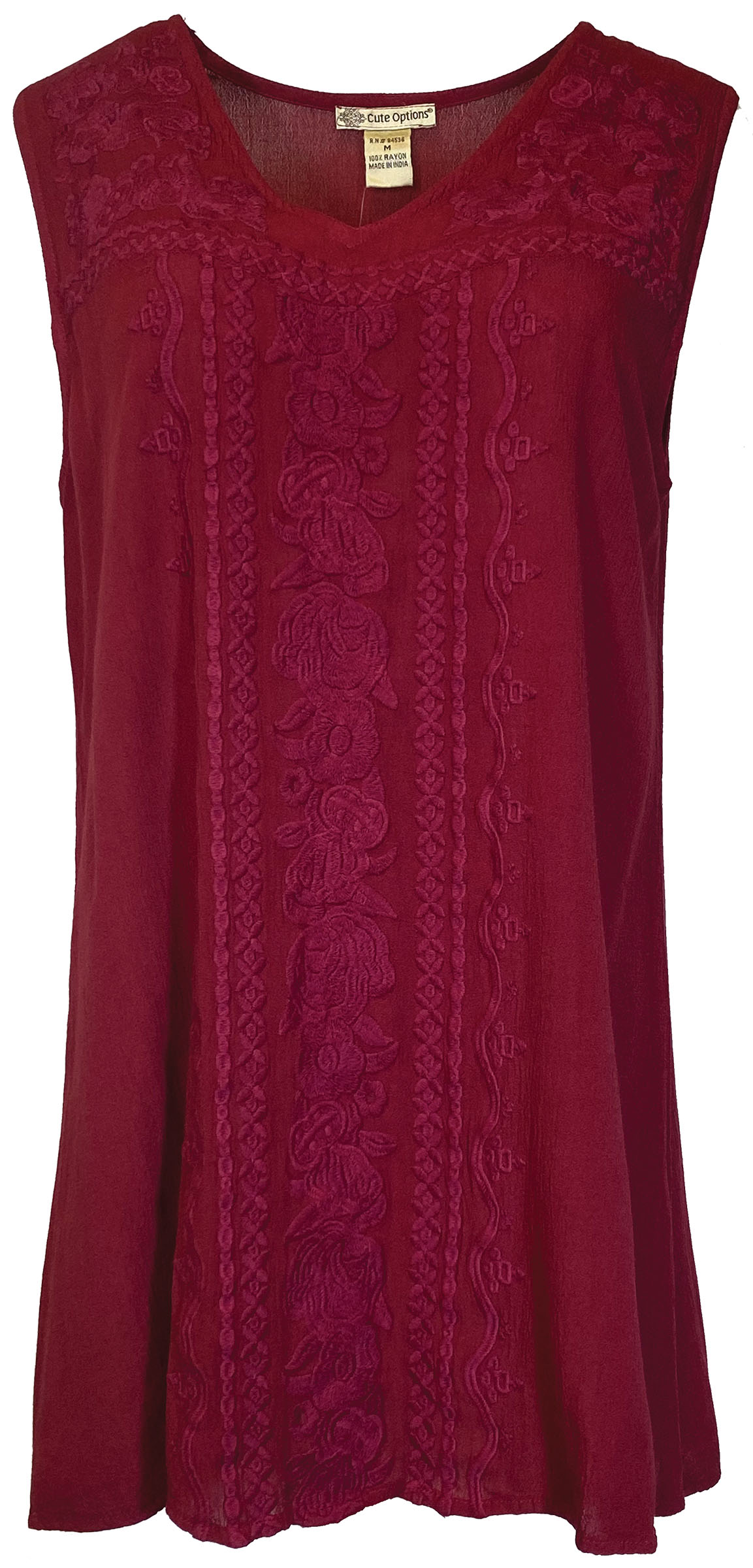 CUTE OPTIONS WOMENS SLEEVELESS TOP FEATURES A V NECK AND GORGEOUS EMBROIDERY. PERFECT FOR SUMMER.